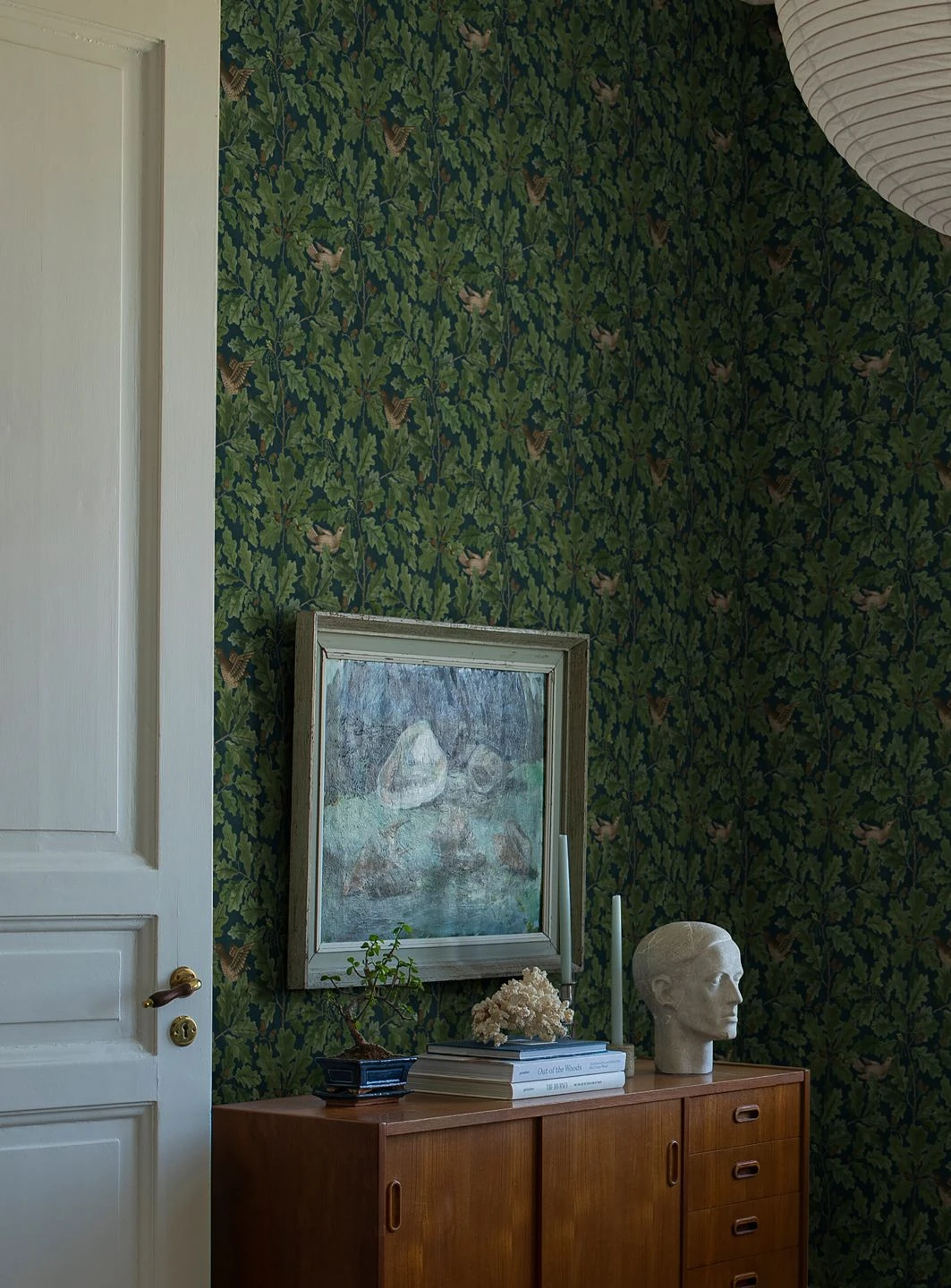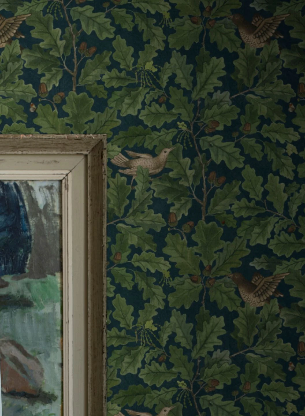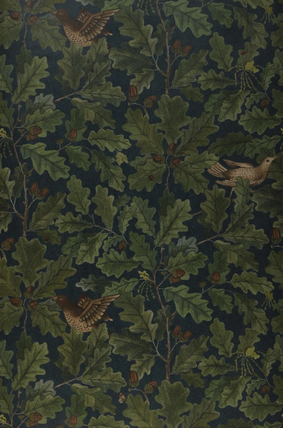 Kräftiges, satt grünes Eichenlaub bietet angenehmen Schutz vor zu viel sommerlicher Hitze – für Ihren gemütlichen Raum, aber ebenso für die Vögel und Insekten, die sich zwischen Blättern, Blüten und Eicheln inmitten der Zweige aufhalten. Die gedeckten Grün- und Brauntöne auf dem blaugrünen Grund zaubern eine ruhige Stimmung und passen ausgezeichnet zu Vintage-Einrichtungen oder dem skandinavischen Stil.