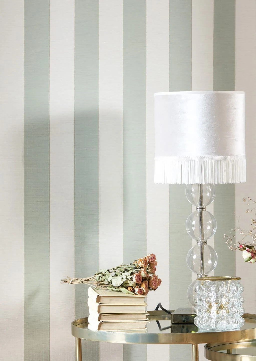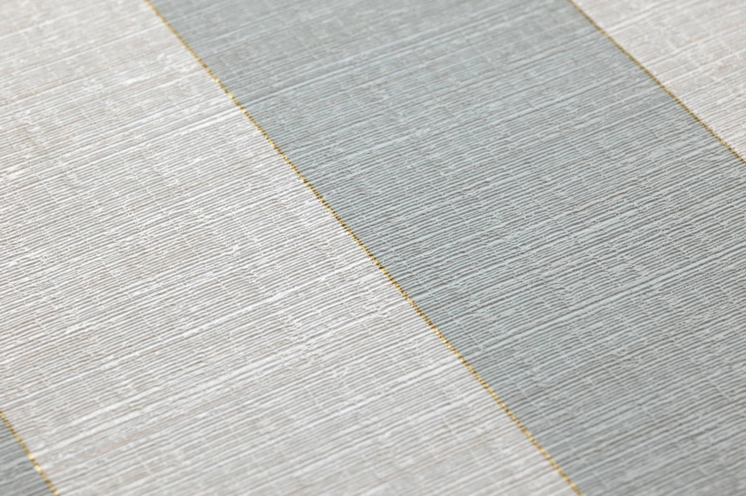Helles Minttürkis und Weiß in breiten Streifen ergeben eine vornehm zurückhaltende Farbkombination für Ihre vier Wände. Feine goldfarbene Linien setzen die Streifen voneinander ab und entfalten einen warmen Schimmer. Die fühlbare Struktur der Oberfläche lässt die Tapete wirken wie ein Wandschmuck aus Textil. Gleichzeitig macht das Vinyl sie scheuerbeständig und mit ihren sanften Farben selbst für Ihr Badezimmer bestens geeignet.