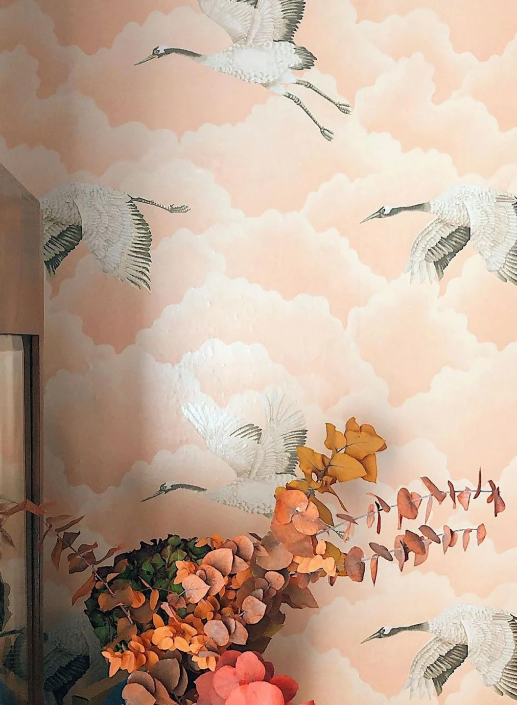 Kraniche, die in der japanischen Kultur als Glücksbringer gelten, ziehen ihre Bahnen zwischen den stilisierten, beigerot schattierten Wolken. Das Gefieder der großen Vögel ist in Dunkelbraun, Beige und schimmerndem Cremeweiß gezeichnet und mit Details in Perlgold verschönert. Mit den Mitteln der asiatischen Kunst perfektioniert die Vliestapete Ihre Einrichtung im minimalistischen, geradlinigen fernöstlichen Stil.