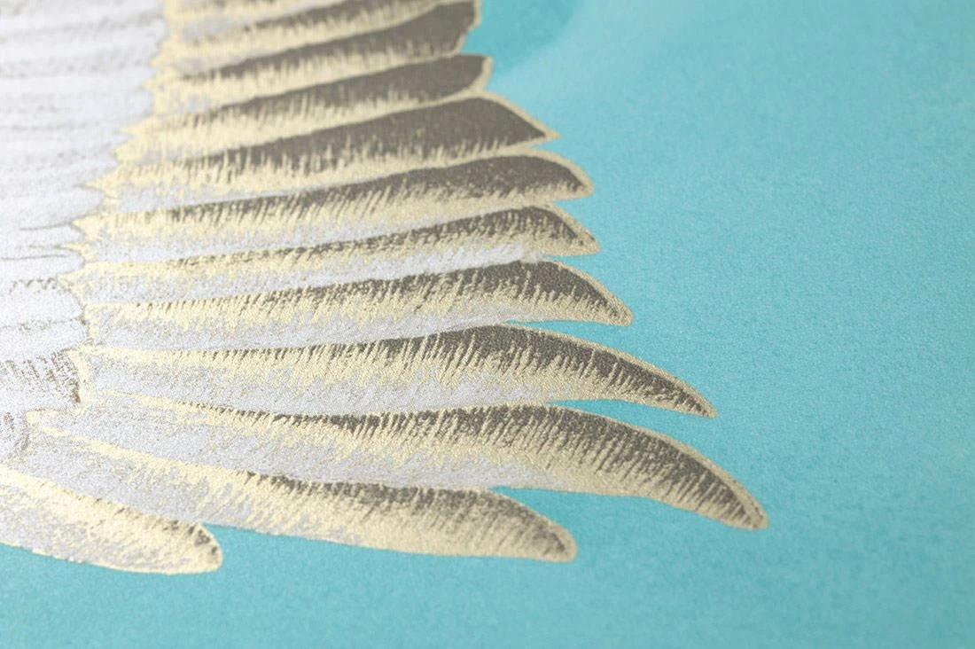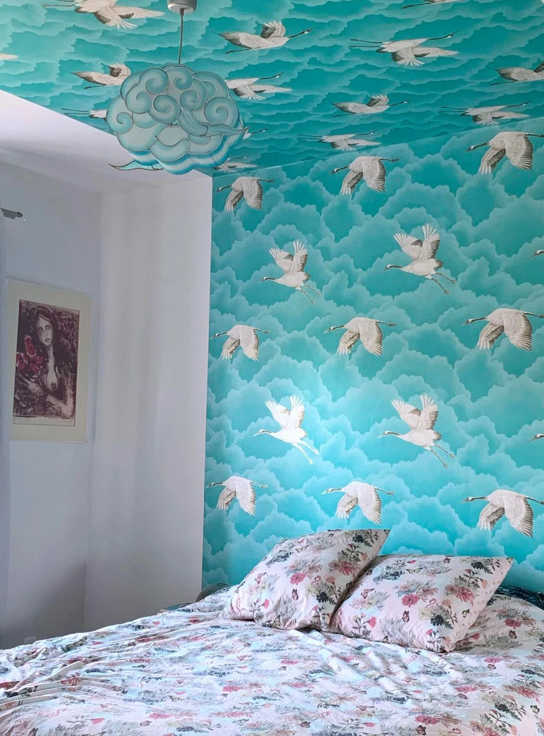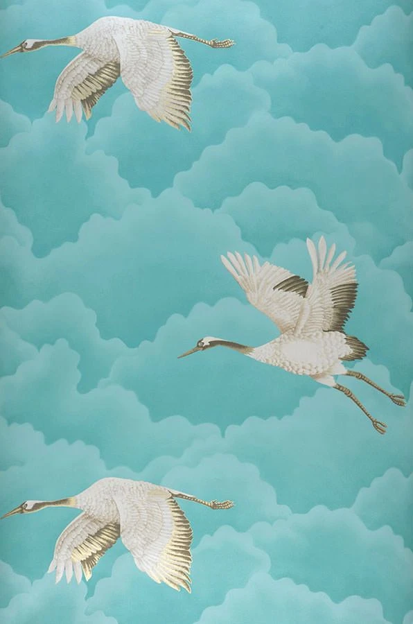 Über einen sommerlich türkisblau leuchtenden Himmel voller bauschiger Wolken ziehen majestätische Kraniche ihre Bahnen. Die großen Vögel gelten in der japanischen Kultur als Symbole für Glück und langes Leben. Die Illustrationen voller liebevoller Details wie den perlgolden schimmernden Akzenten an den Schwungfedern und den Hälsen verschönern Ihr Zuhause im asiatischen Stil, sind aber auch für andere Einrichtungsstile eine beglückende Ergänzung.