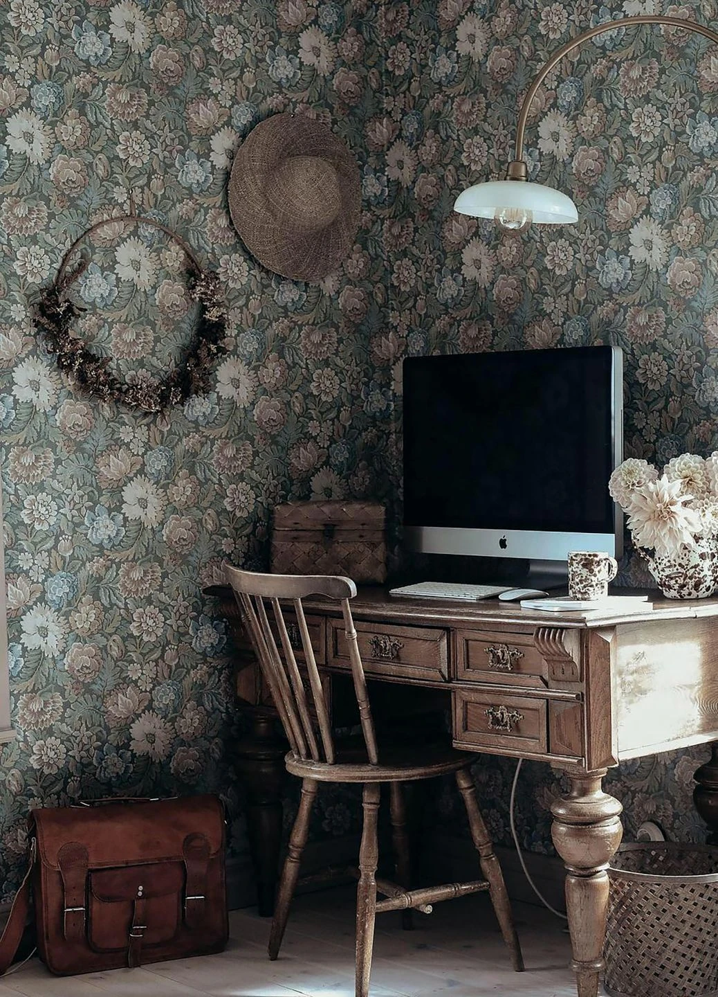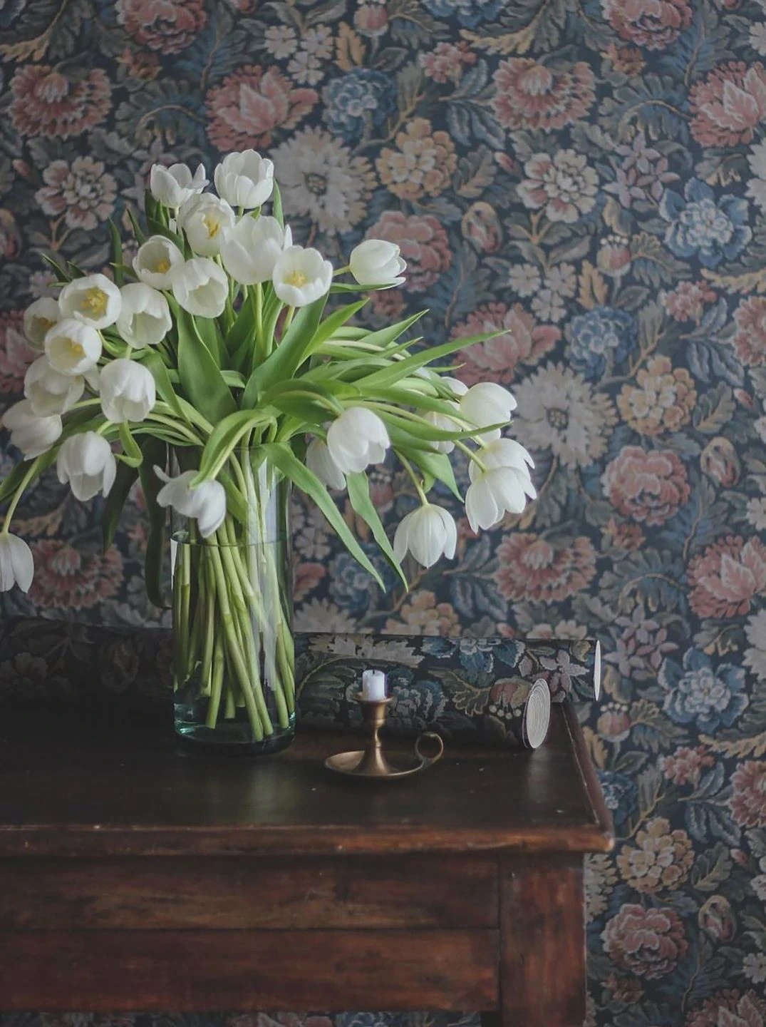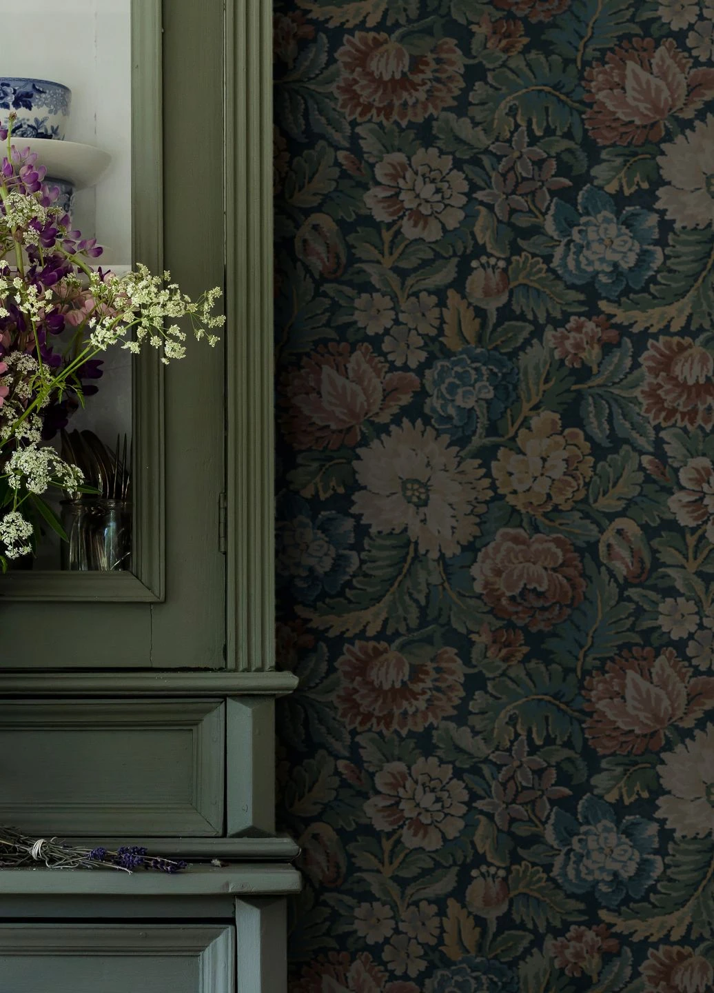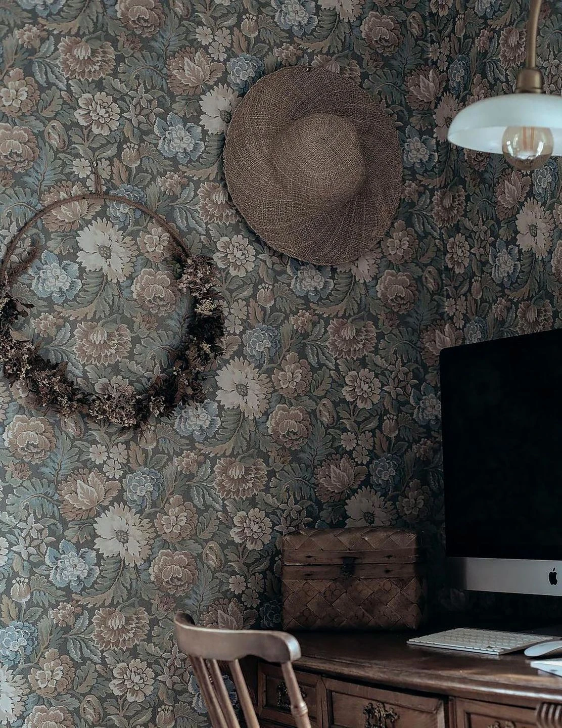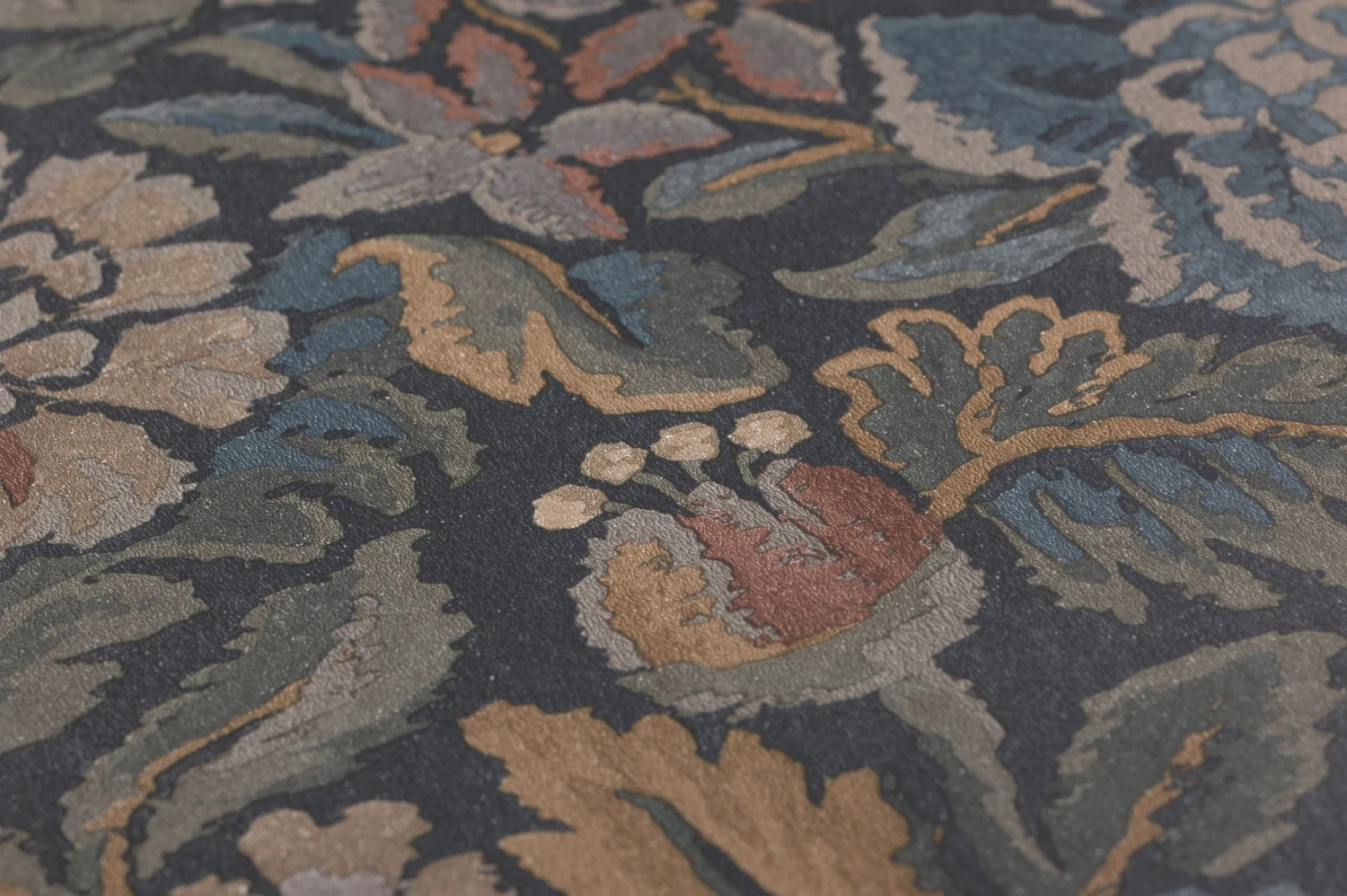Gedeckte, edel wirkende Farben prägen das prachtvolle Blumenmuster auf dem tief anthrazitfarbenen, ganz leicht gemusterten Untergrund der Vliestapete. Das Zusammenspiel der Farben und der Farbauftrag wirken zusammen für den Eindruck eines wertvollen Wandbehangs, der Ihre Räume zu einer Kostbarkeit macht. Die florale Tapete Isola unterstützt die Wirkung antiker, dunkler oder in einer der Musterfarben gestrichener Möbel wunderschön.