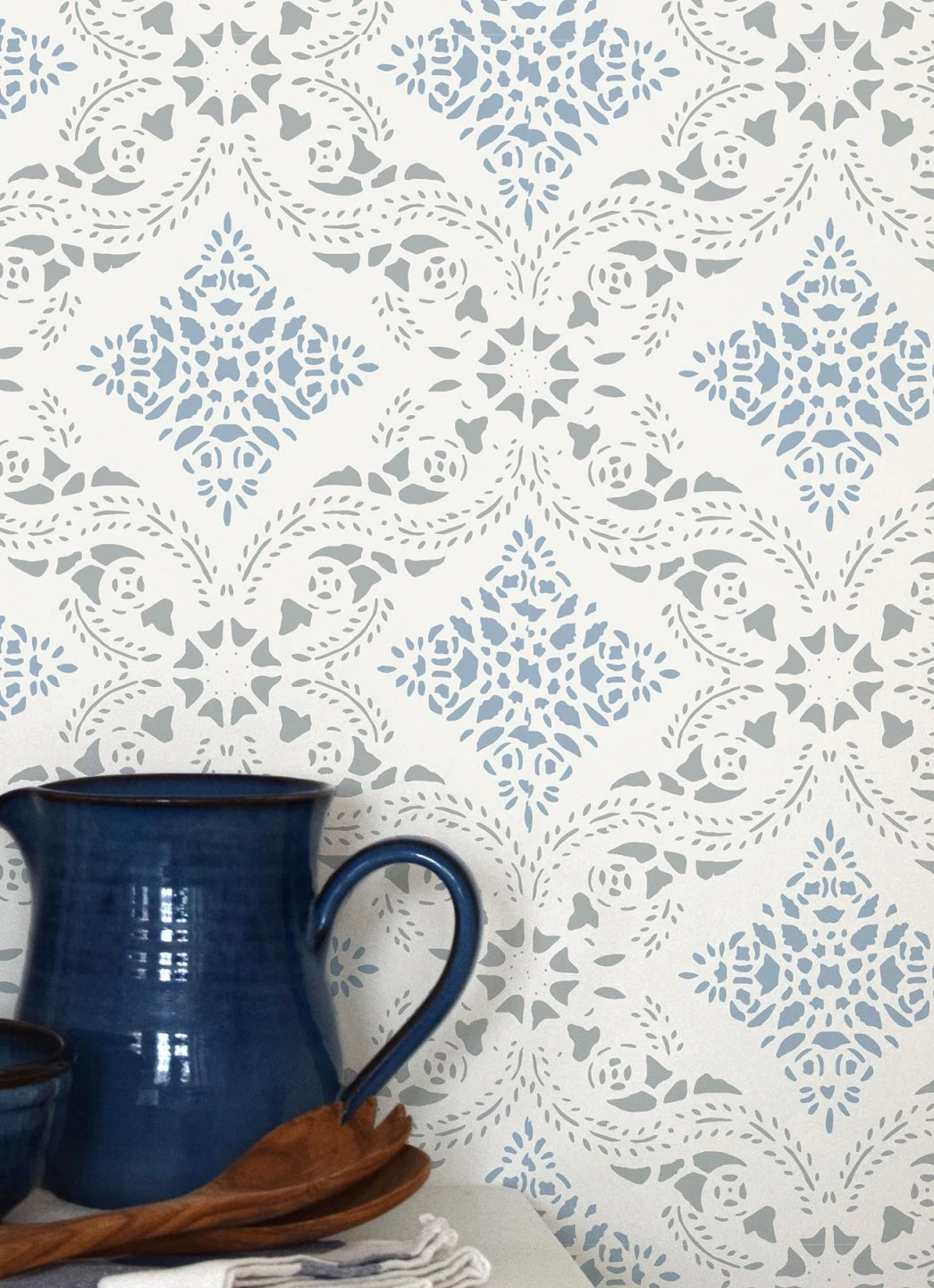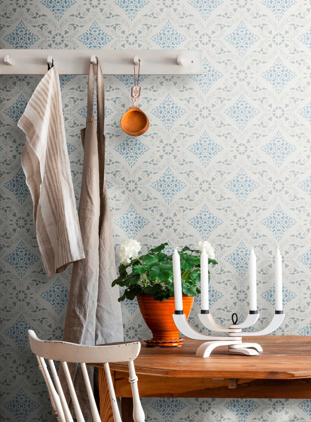 Freunde der ländlich edlen Romantik zieren mit diesem historischen Rautenmuster Küche, Esszimmer oder Schlafraum und schwelgen in der guten alten Zeit. Die harmonische Farbstellung in Grau, Blau, Weiß erlaubt Kombinationen mit allen Holznuancen, aber auch mit Weiß und Shabby Chic Farben. Die Leimdruck Optik der eleganten Vliestapete macht den authentischen Charakter perfekt.