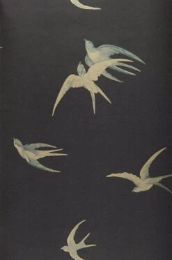Zart wie mit Wasserfarben gezeichnet sind die Schwalben auf dieser Papiertapete. Schimmernd in Blassgraublau und Gold heben sie sich deutlich vom dunkel schwarzgrauen Untergrund ab. Edel und vornehm wirkt die Kombination aus dem dunklen Grund und den hellen Silhouetten der Sommerboten, die luftige Leichtigkeit beisteuern. Die Tapete im Landhaus-Stil lässt sich vielfältig zu einem eleganten Erscheinungsbild kombinieren.