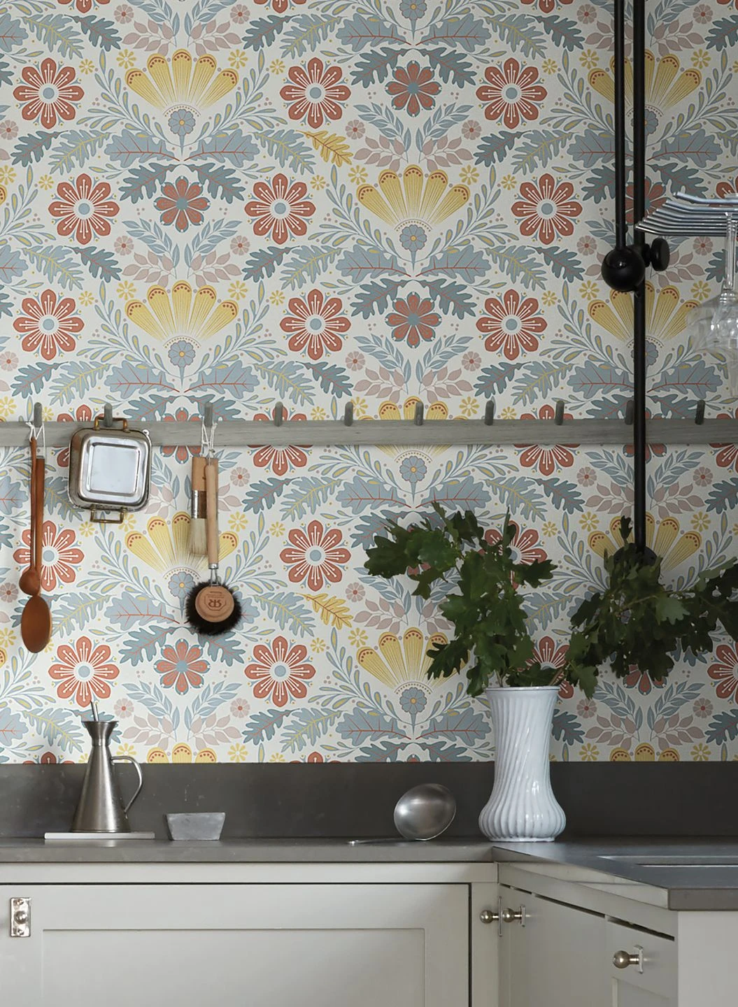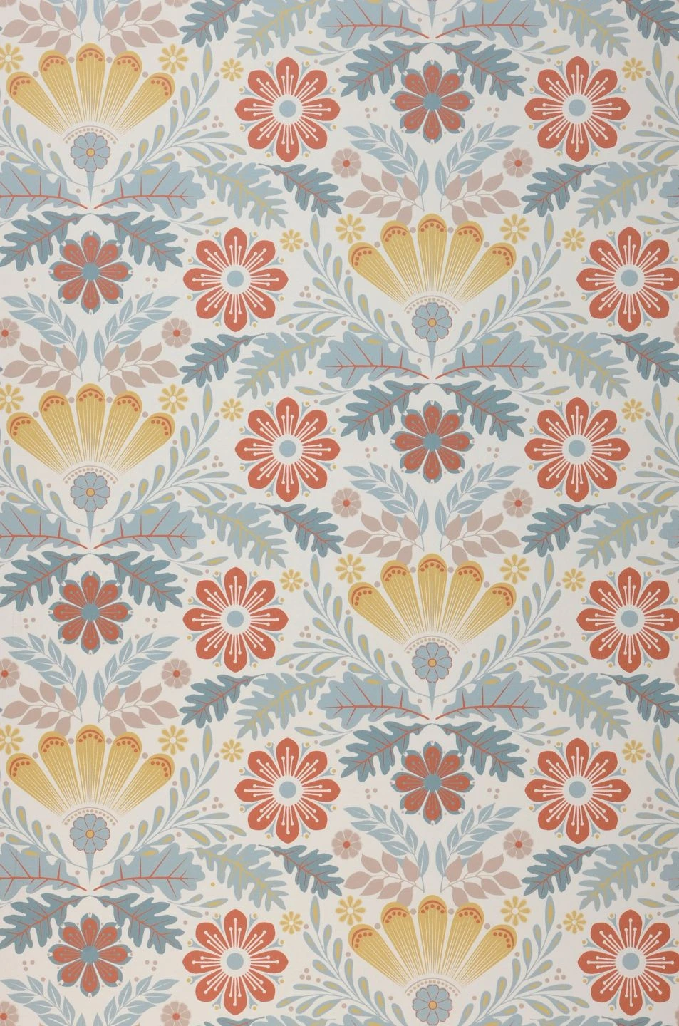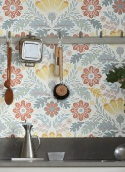 Blumen schmücken jeden Raum und verbreiten gute Laune! Hier sind die stilisierten Blüten und Blätter auf dem weißen Grund so schön angeordnet, dass ein geordneter und dennoch belebter Eindruck entsteht. Durch das Spiel mit verschiedenen Helligkeitsstufen des zarten Grünblau und Pastellblau der Blätter und der Rot- und Gelbtöne der Blüten erzielt das Muster trotz aller Stilisierung ein Gefühl von Tiefe, von Vordergrund und Hintergrund, das Ihre Wand wirkungsvoll auflockert.