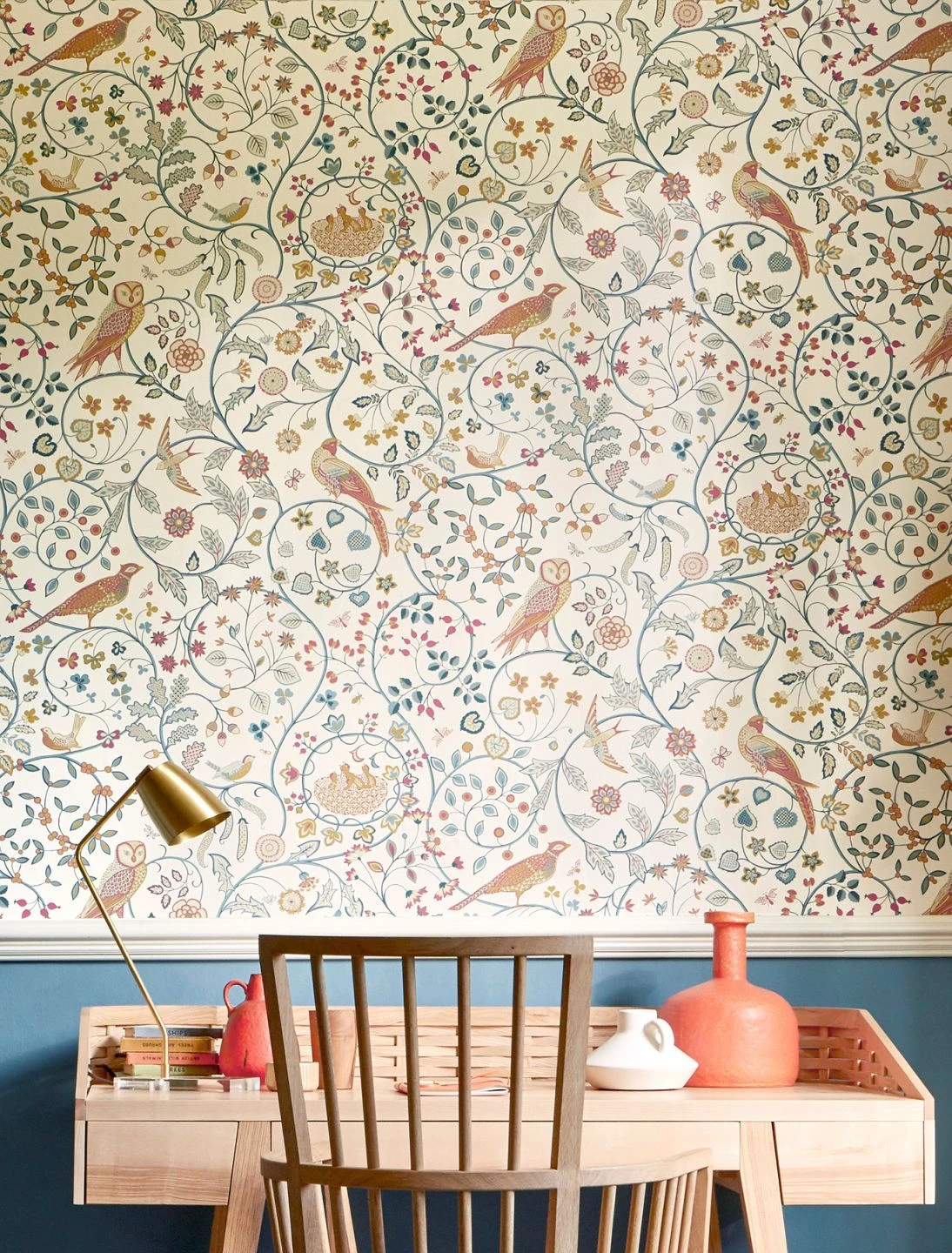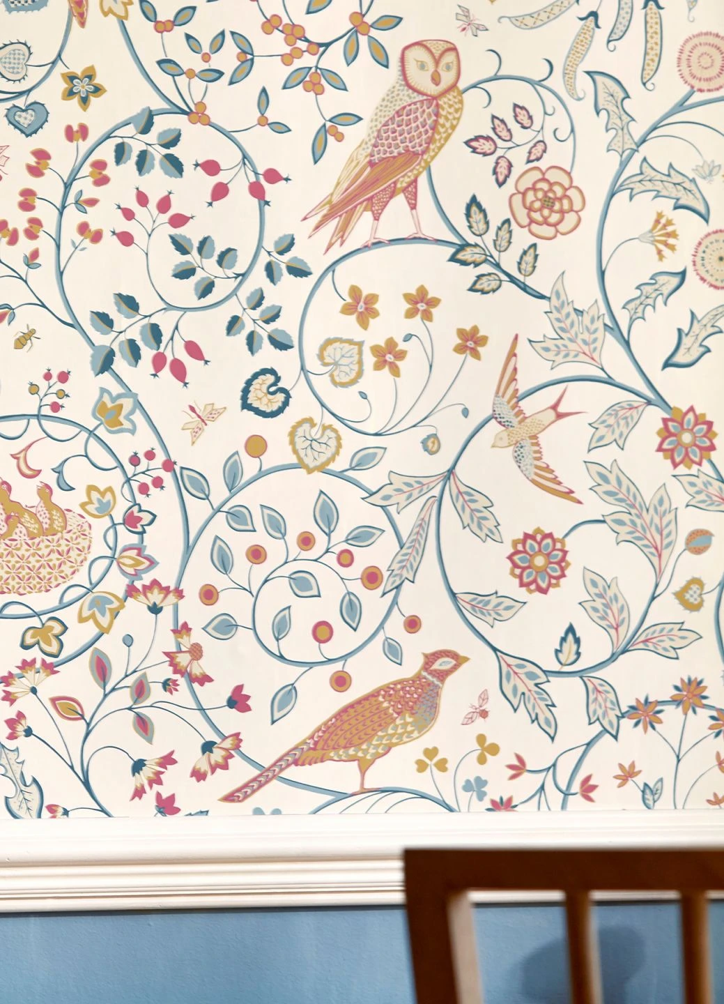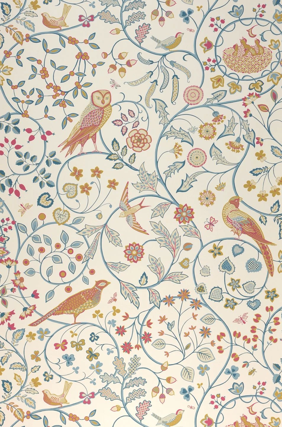 Vielleicht ist diese Romantik Tapete an das Grimm-Märchen Jorinde und Joringel angelehnt, in dem Vögel wie Eule, Taube und Nachtigall eine große Rolle spielen. In jedem Fall erzählt auch diese elegante Papiertapete mit überschwänglichem Jugendstilmuster in Cremweiß, Currygelb, Pastell- und Ozeanblau sowie Rotviolett eine eigene bewegende Geschichte.
