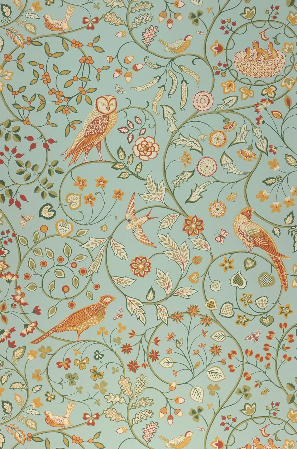 Märchenhaft und nach Art des filigranen Jugendstils eröffnet die romantische Tapete neuen Gestaltungsspielraum. Der türkise Blauton bildet einen himmlischen Hintergrund für die muntere Vogelschar, die mit viel Liebe zum Detail ausgearbeitet ist.