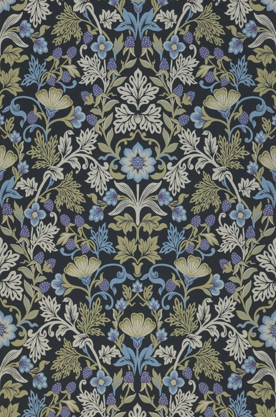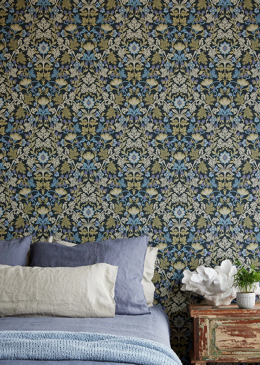 Ein klassisches Blumenmuster wie das einer imposanten Barocktapete gewinnt hier durch die verschiedenen Blautöne und das zurückhaltende Schilfgrün und Achatgrau kühle Eleganz. Auf dem anthrazitgrauen Untergrund strahlen die Farben der stilisierten Blüten, Blätter und Beeren geradezu. Für Ihr Schlafzimmer in hellen Farben oder ein repräsentatives Wohnzimmer ist Vliestapete Josefin eine elegante, traditionsbewusste und zugleich zeitlos heutige Bereicherung.