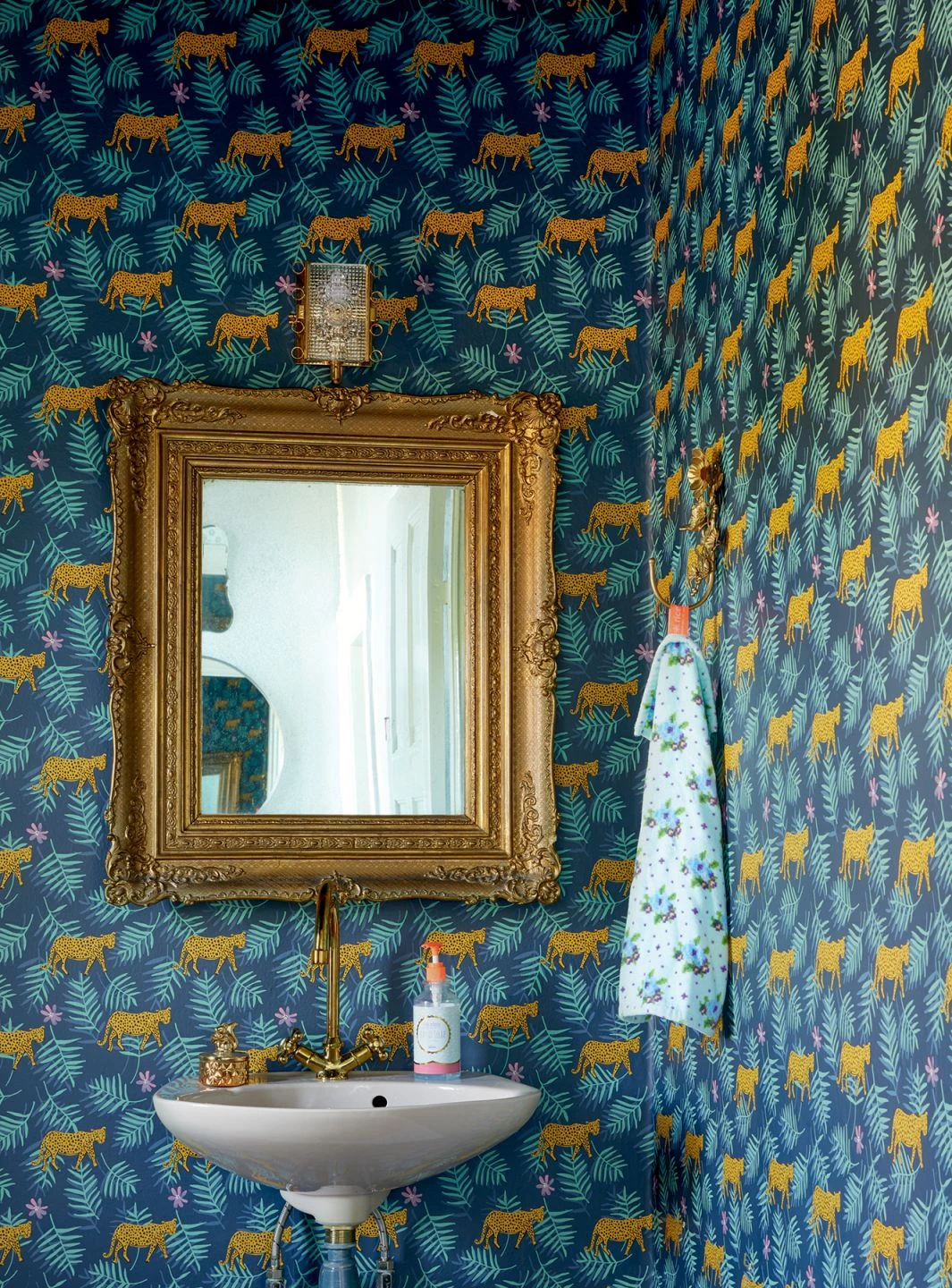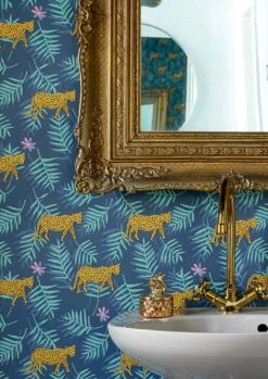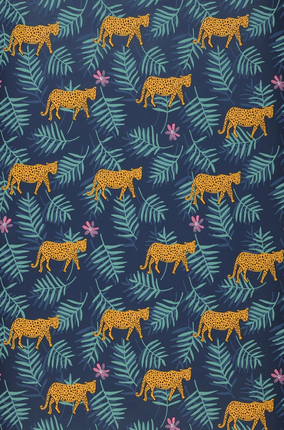 Palmwedel und erikaviolette Blüten sorgen für eine exotische Atmosphäre – aber im Mittelpunkt stehen die schön gezeichneten Leoparden im leicht folkloristisch angehauchten Stil! Auf dem graublauen Grund fällt ihr goldgelbes Fell mit den charakteristischen Tupfen besonders ins Auge, während das Violett der Blumen und das Minttürkis und Brillantblau der Palmenzweige einen harmonischen Hintergrund ergeben.