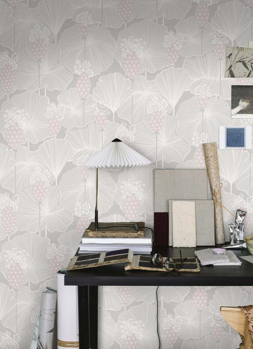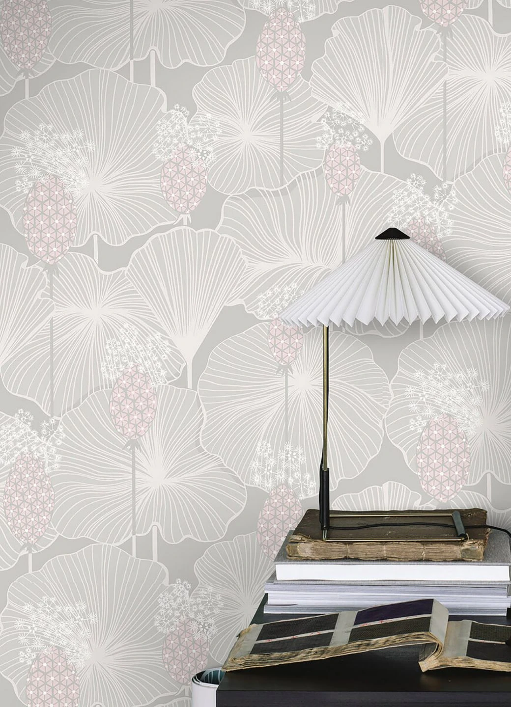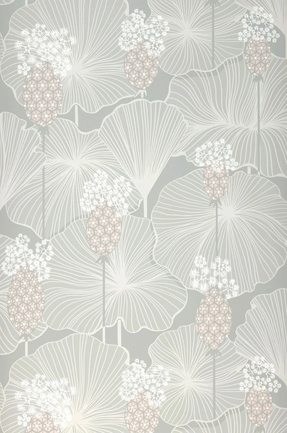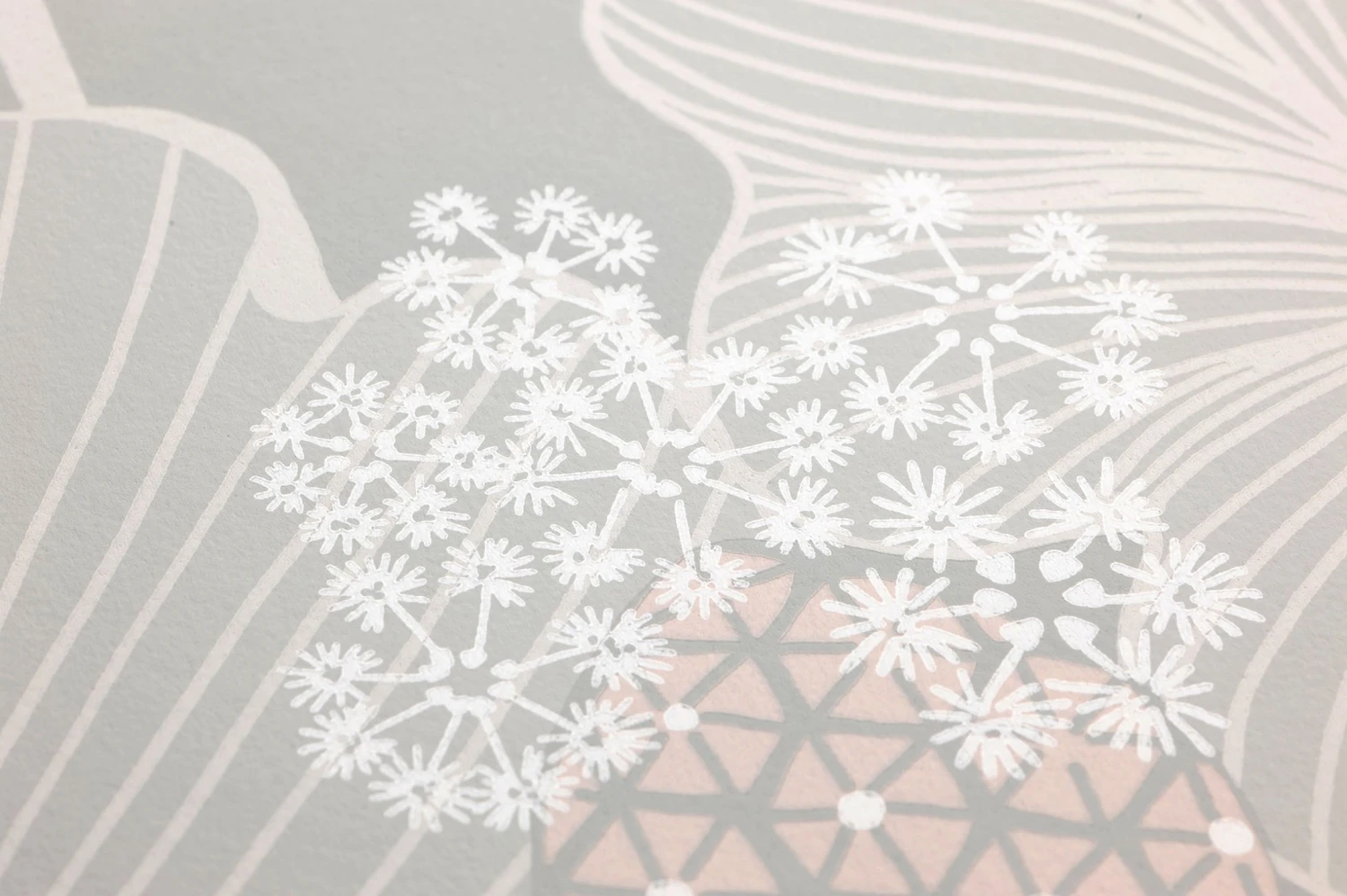 Aus einfachen geschwungenen Linien, Punkten und Dreiecken entstehen üppige schirmartige Blätter und stilisierte sternförmige Blüten. Hell und freundlich wirkt die Vliestapete mit ihrem ausladenden Muster in Cremeweiß, blassen Grautönen und zartem Rosa auf einem hellgrauen Grund. Durch die ausgewogenen hellen Farben stellt sie eine belebte, sich jedoch dezent zurückhaltende Kulisse für Ihren Raum dar.