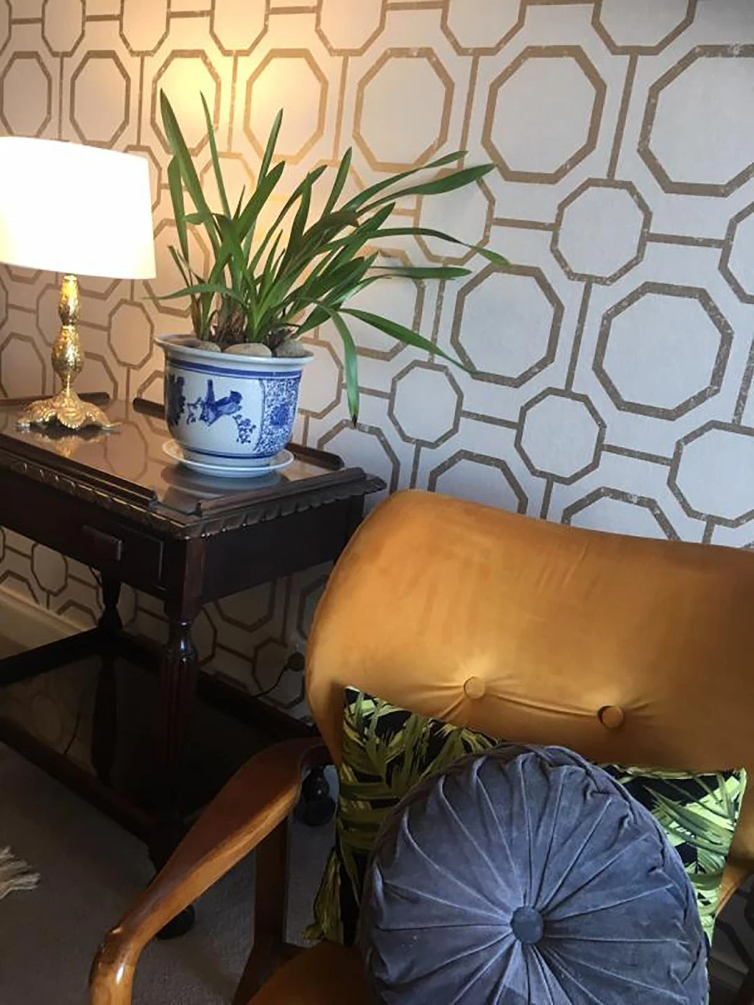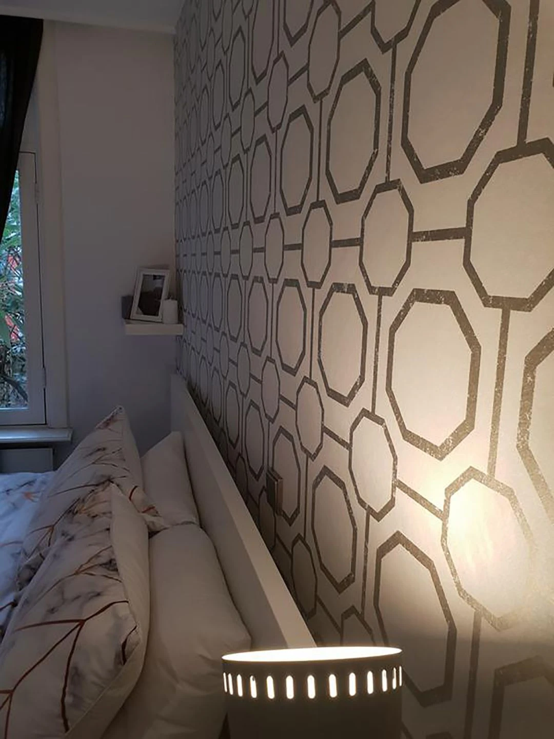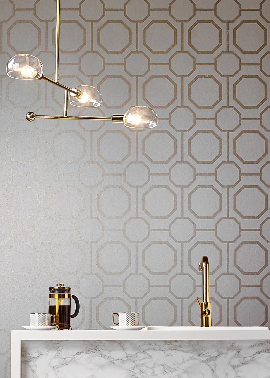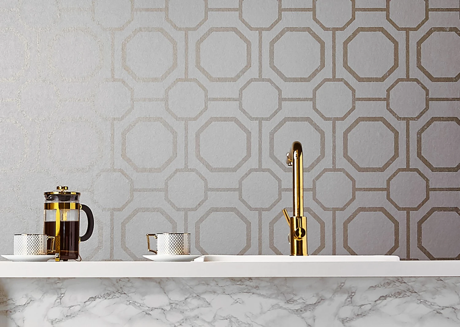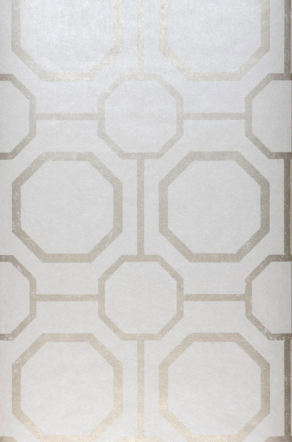 Achtecke in verschiedenen Größen ergeben sich in ein raffiniertes Musterspiel, das von feinen Linien durchkreuzt wird. Die Farbkomposition aus Perlgold und Cremeweiß verleiht der modern interpretierten Orient-Ornamentik eine Grand-Hotel-Aura. Seien Sie zu Gast in Ihrem eigenen Luxusdomizil und fühlen Sie sich von Exklusivität umschmeichelt.