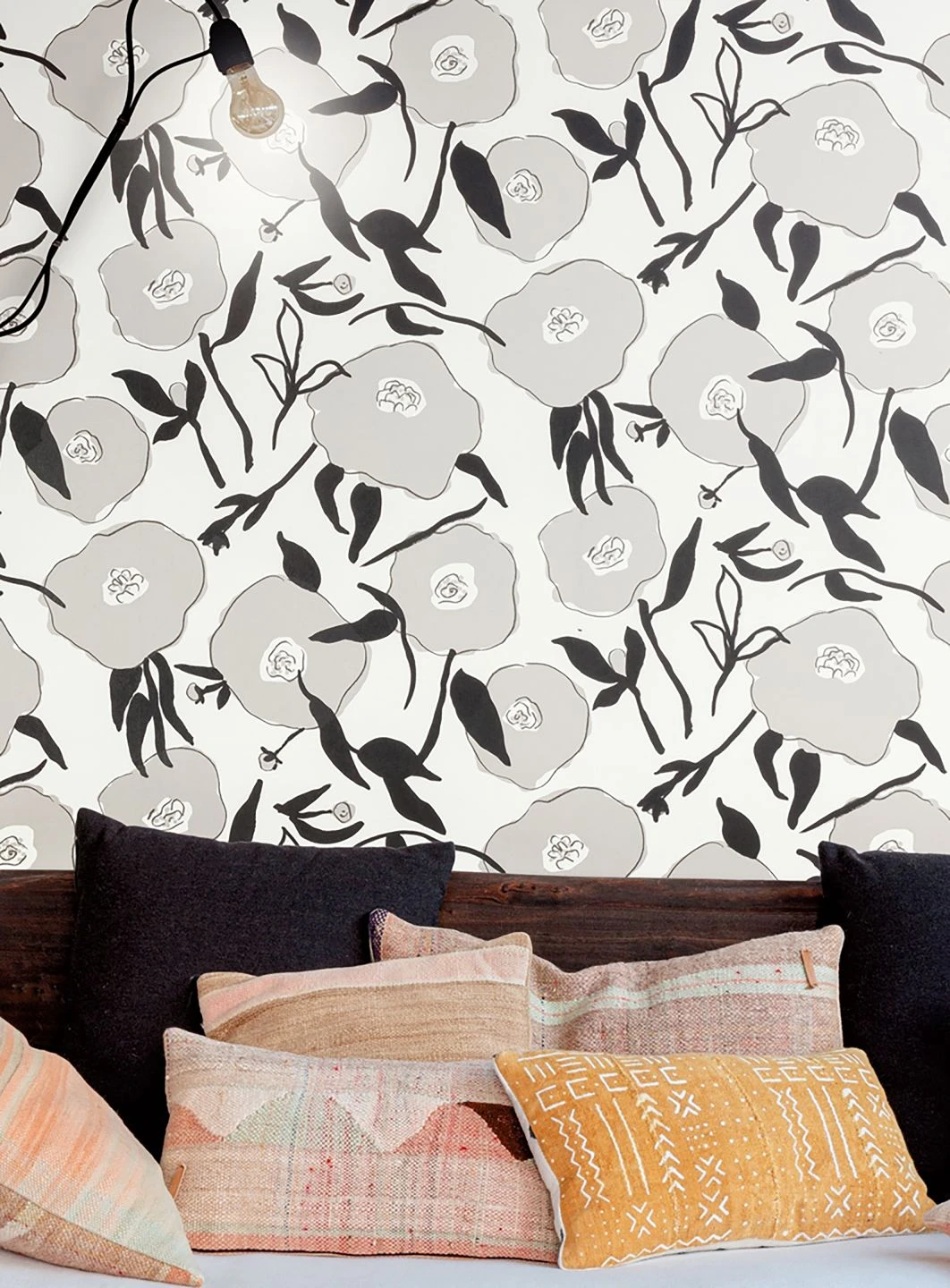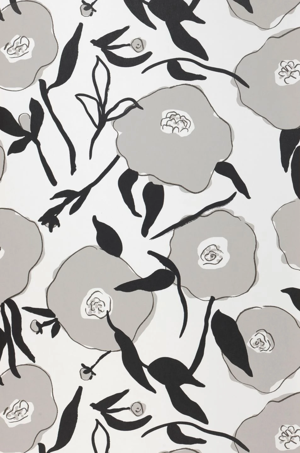 Ein eindrucksvolles Schwarzweißbild bringt die florale Tapete Kanoko an Ihre Wand. Mit wenigen Strichen sind stilisierte Blumen mit großen Blüten, Knospen und Blättern angedeutet. Die Beschränkung auf graue und schwarze Linien und Flächen auf dem weißen Grund verstärkt den stilisierten Effekt der expressiv gemalten Blumen. Kanoko führt die Tradition des Blumenmusters in eine neue Dimension.