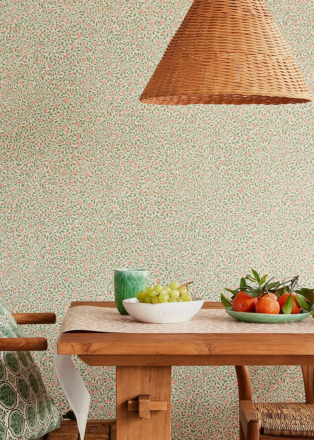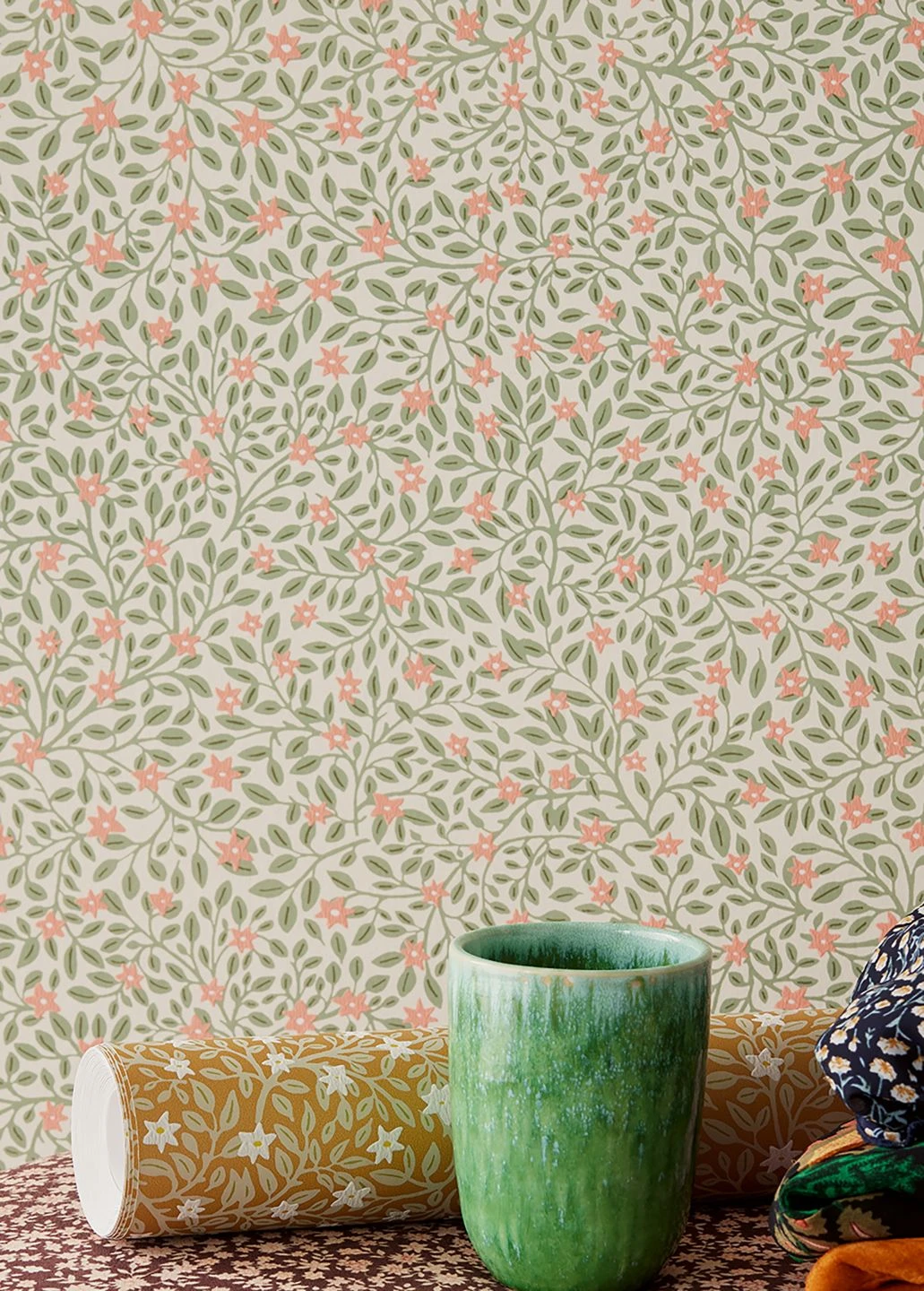 Ein zartes Blumenmuster, das mit den feinen Blattranken und den sternförmigen lachsorangefarbenen Blüten an den Frühling erinnert. Auf dem zartgrünen Grund wirkt das Design luftig und leicht. Holzmöbel in allen Naturtönen passen wunderschön zur Vliestapete Karina – in einer Küche ebenso gut wie in Ihrem Esszimmer, Wohnzimmer oder Schlafzimmer. Wer würde sich inmitten dieser Blütenzweige nicht zu Hause fühlen?