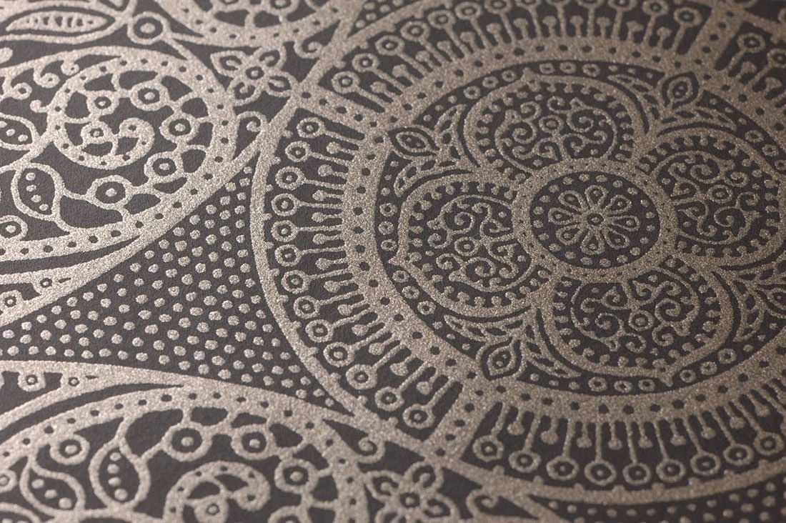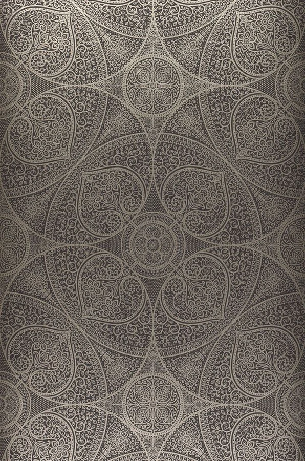 Durch die Verschmelzung von floralen mit geometrischen Elementen in großen und kleinen Kreisen entsteht der Eindruck einer Indischen Henna-Zeichnung. Das leichte Schimmern des Musters hebt sich gut vom matten Untergrund ab. So kommt es zu einem perfekten farblichen Zusammenspiel von Graubraun und Perlbeige.