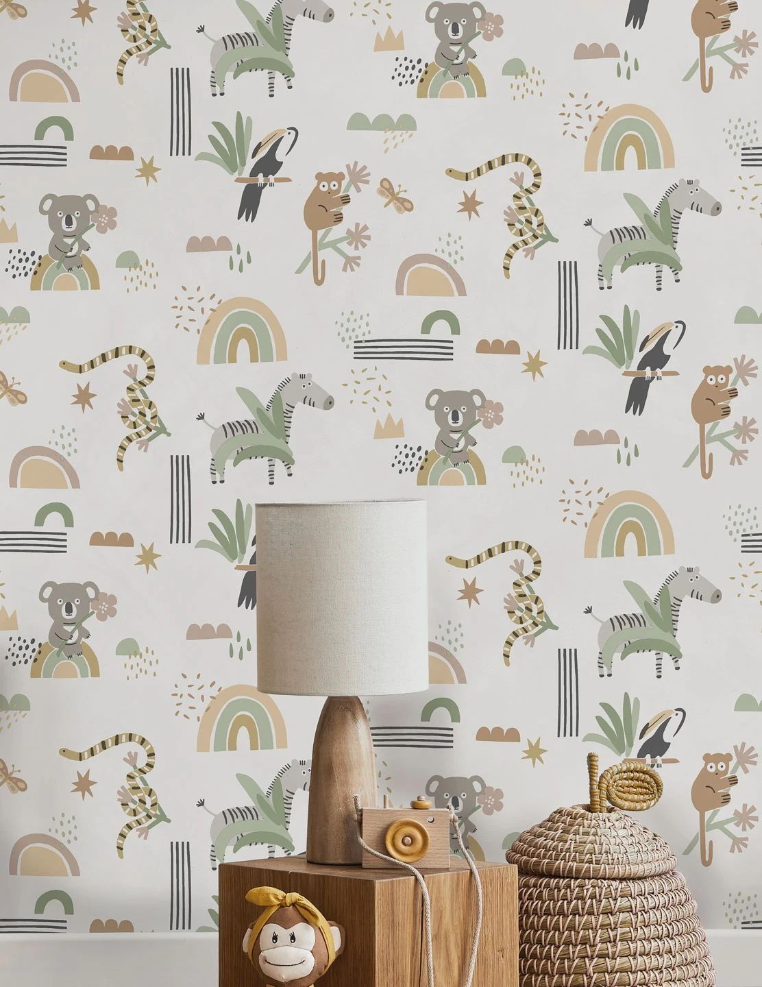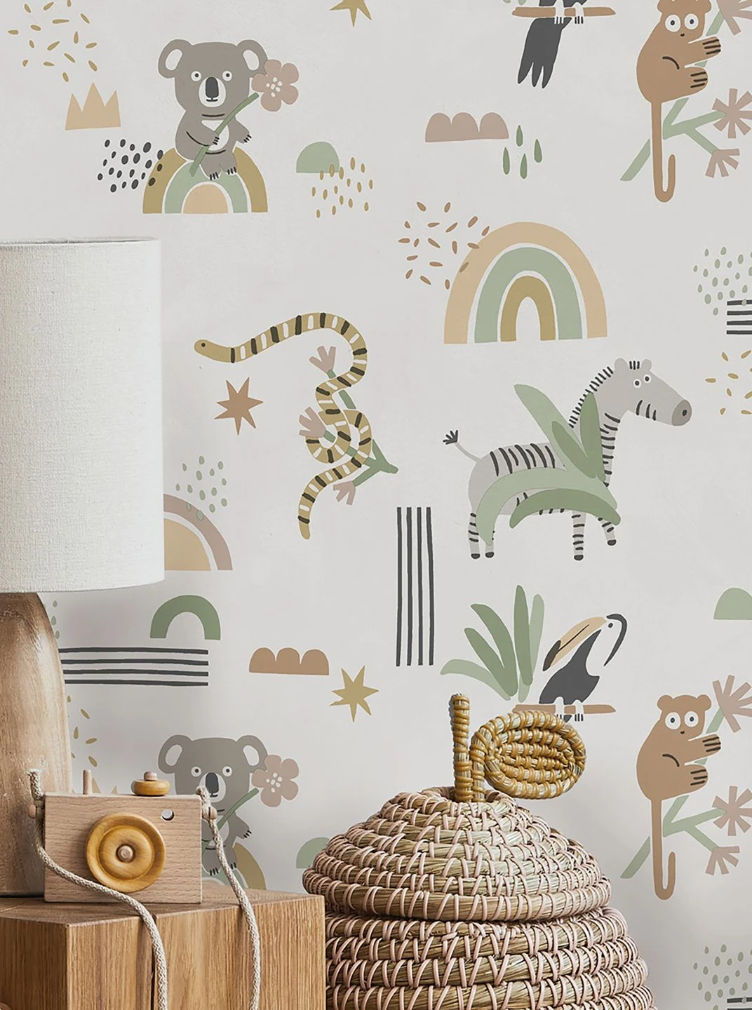 Wie die Abbildungen in einem fantasievollen Bilderbuch sehen die verschiedenen exotischen Tiere aus, die sich hier wie in einem großen Zoo an der Wand versammelt haben. Zebras, Koalabären, Schlangen, Tukane – hier gibt es vieles zu entdecken und zu beobachten. Helle, perfekt abgestimmte Farben machen die Papiertapete Kiki zu einer ebenso hübschen wie unterhaltsamen Bereicherung für das Kinderzimmer.