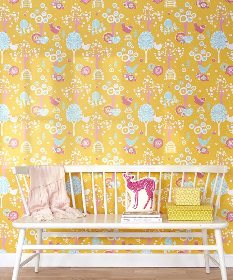 Fruchtiges Maisgelb bestimmt den farblichen Hintergrund der Majvillan Designtapete, die auch Erwachsene in träumerische Stimmung versetzt. Sonnig gute Laune ist damit vorprogrammiert. Buntes Frühlingserwachen, das zu neuen Taten anregt, symbolisieren die teils stilisierten Musterelemente aus der Natur.
