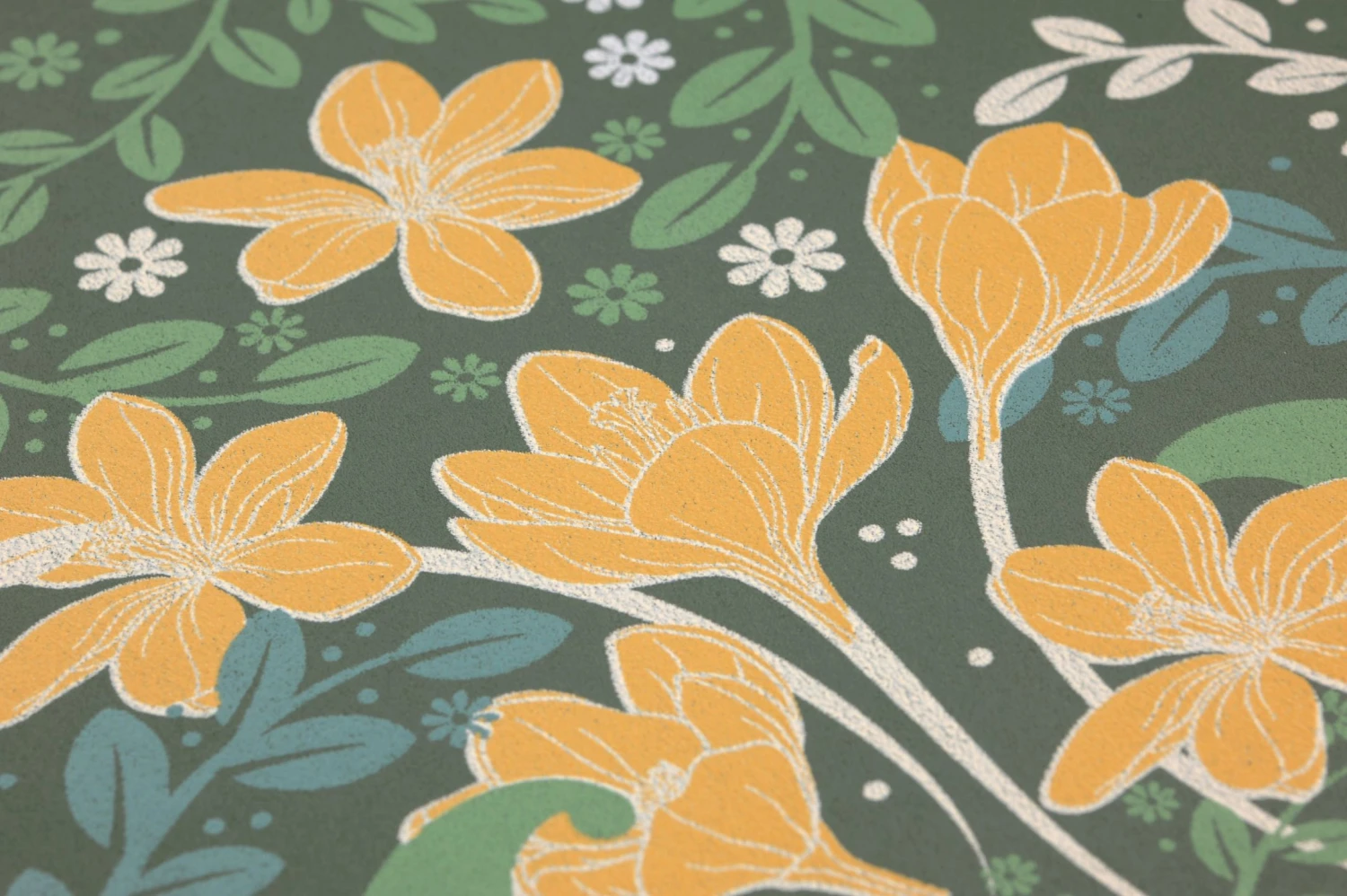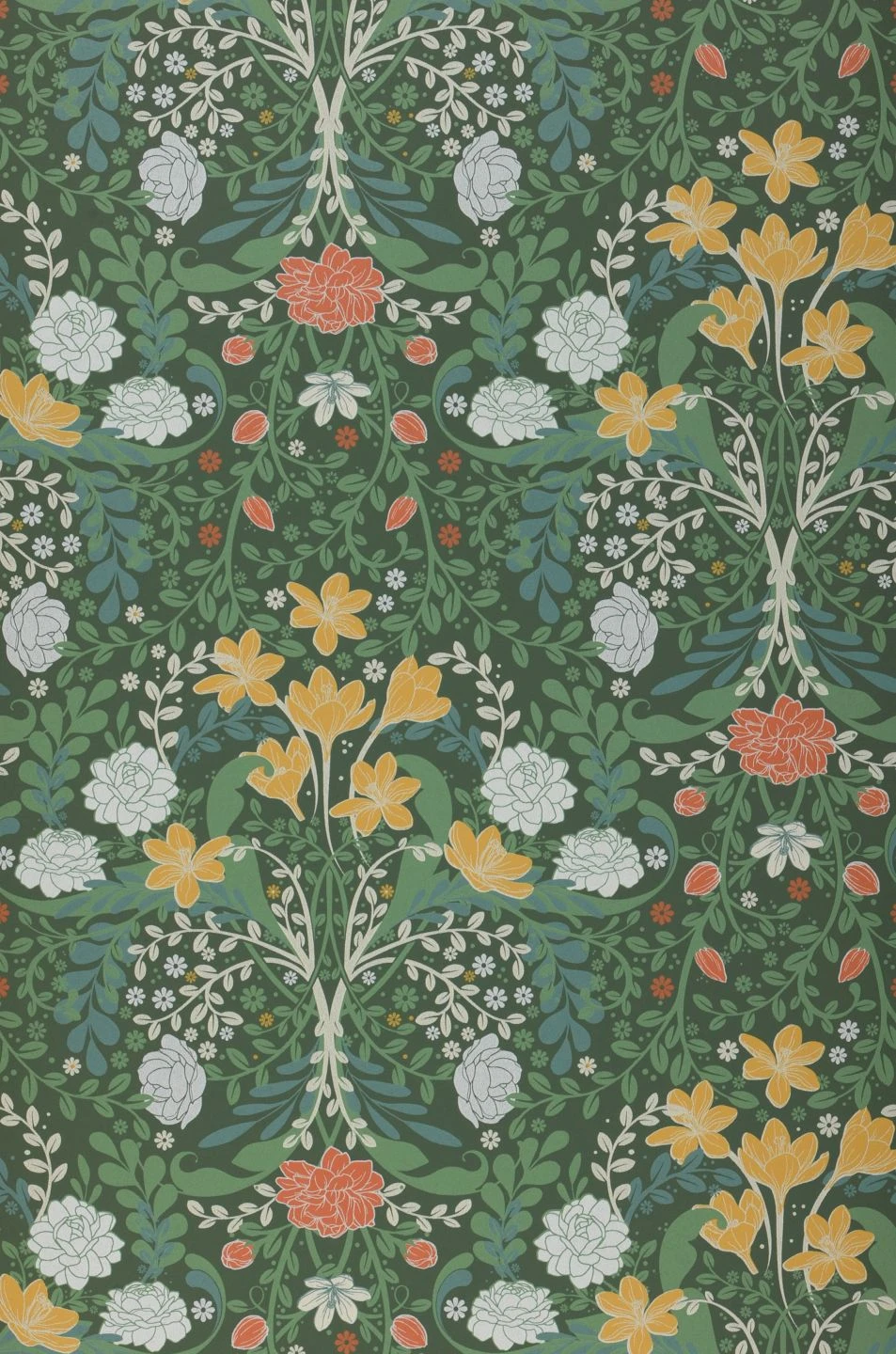 Inmitten eines dichten Geflechts von Blattranken in verschiedenen Grüntönen auf dunkelgrünem Grund ziehen stilisierte Blüten in Rot, Maisgelb, Azurblau und Grauweiß den Blick des Betrachters auf sich. Mit feinen grauweißen Pinselstrichen gezeichnete Umrisse betonen die unterschiedlichen Formen ihrer Blütenblätter. Die kunstvoll angeordneten Zweige, Ranken und Blüten finden zusammen zu einer übergeordneten Harmonie.