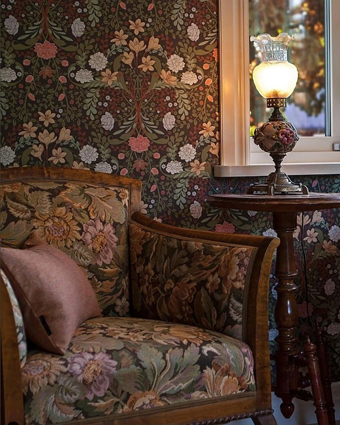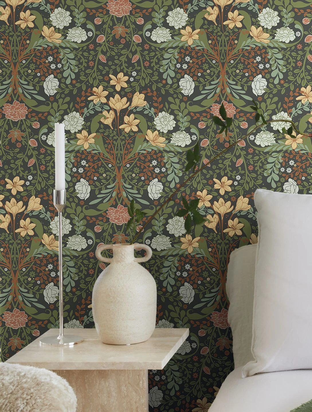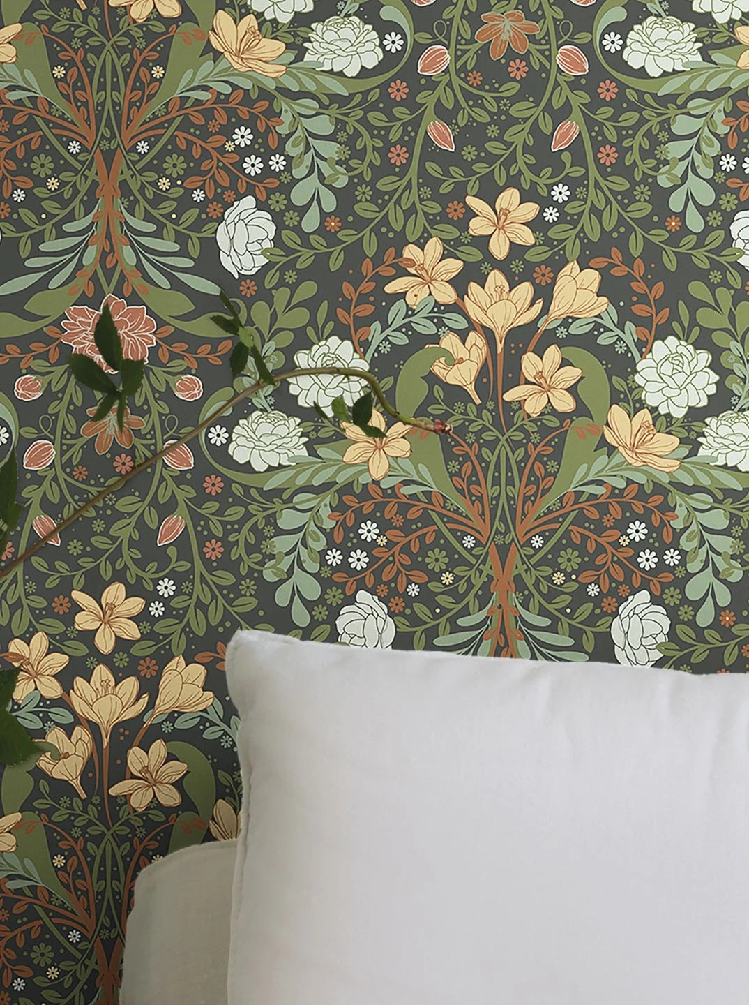 Ein wenig Nostalgie bringt Tapete Kristina mit ihrem traditionellen Blumenmuster im englischen Stil mit in Ihre vier Wände. Die Farbgebung deckt eine große Bandbreite von Weiß über Hellelfenbein bis hin zu Rot ab. Stilisierte Blüten und Blattranken bedecken den graubraunen Hintergrund fast lückenlos und erhalten farbliche Akzente durch Konturen in Kupferbraun. Mit der hochwertigen Vliestapete unterstreichen Sie die Wirkung von ins Rötliche spielenden Holztönen besonders vorteilhaft.