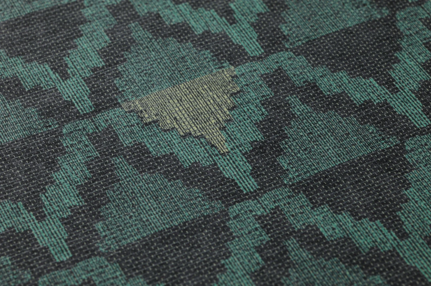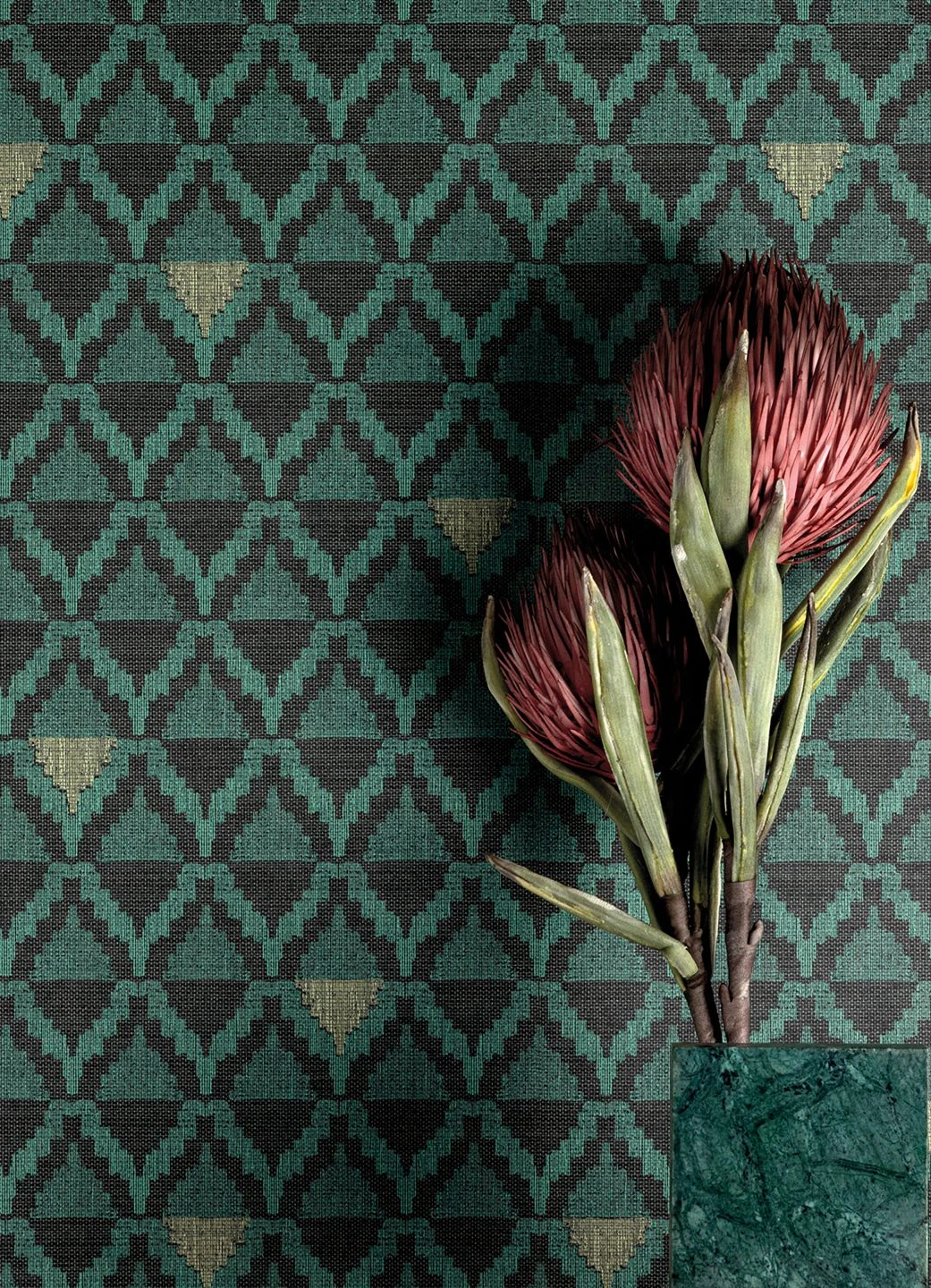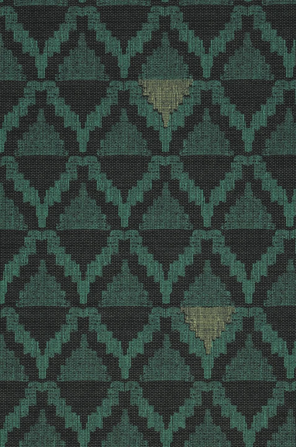 Das helle Patinagrün und der Elfenbeinton leuchten förmlich zwischen den schwarzgrauen Musterelementen hervor. Die verschiedenen feinen Schraffuren erzeugen trotz der glatten Oberfläche der Vliestapete die Anmutung einer Textiltapete. Geheimnisvoll wie in einem orientalischen Märchen wirkt das entstehende Muster aus Rauten und Farbstreifen, das Ihre Wände mit einem Hauch von Exotik belebt.