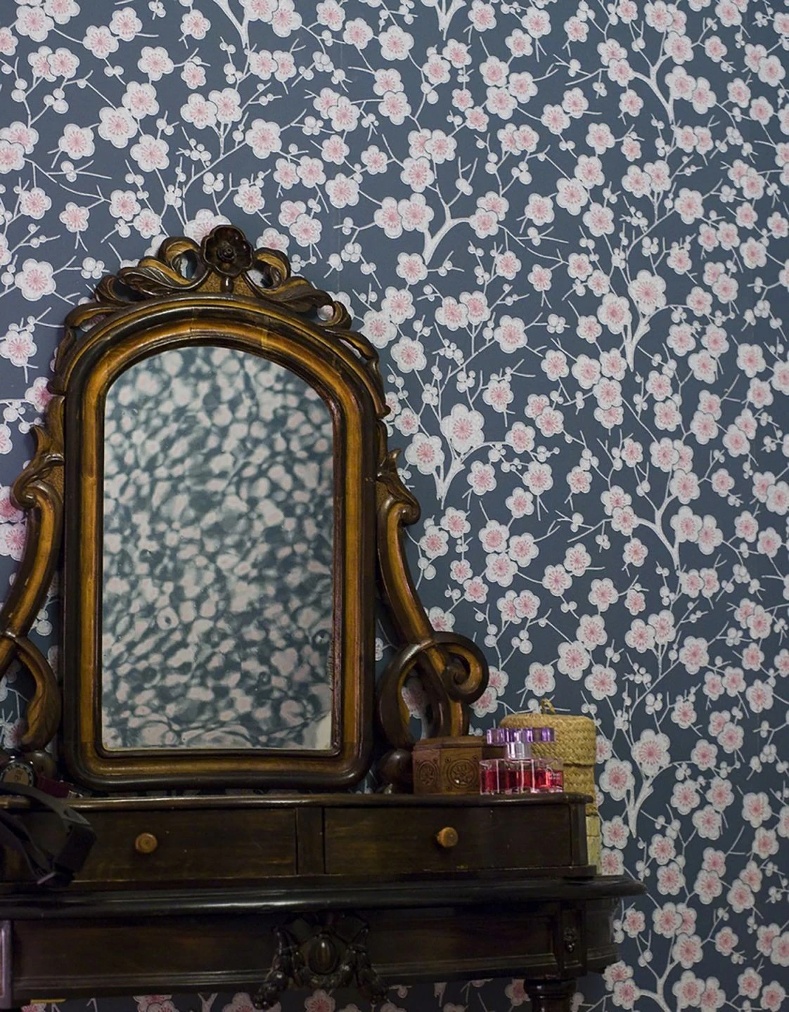 Blaugrau und Weiß – das ist eine Farbkombination voller nordischer Frische! Auf dem blaugrauen Grund sind Kirschzweige in voller Blüte als weiße Silhouetten zu erkennen. Wie zarte Farbtupfer weist jede Blüte rosafarbene Staubgefäße auf. Die hochwertige, im Leimdruckverfahren hergestellte Papiertapete passt ausgezeichnet zum skandinavischen Einrichtungsstil oder auch zu Vintage-Elementen und zaubert den Frühling in Ihre Küche, Ihr Ess- oder Wohnzimmer.