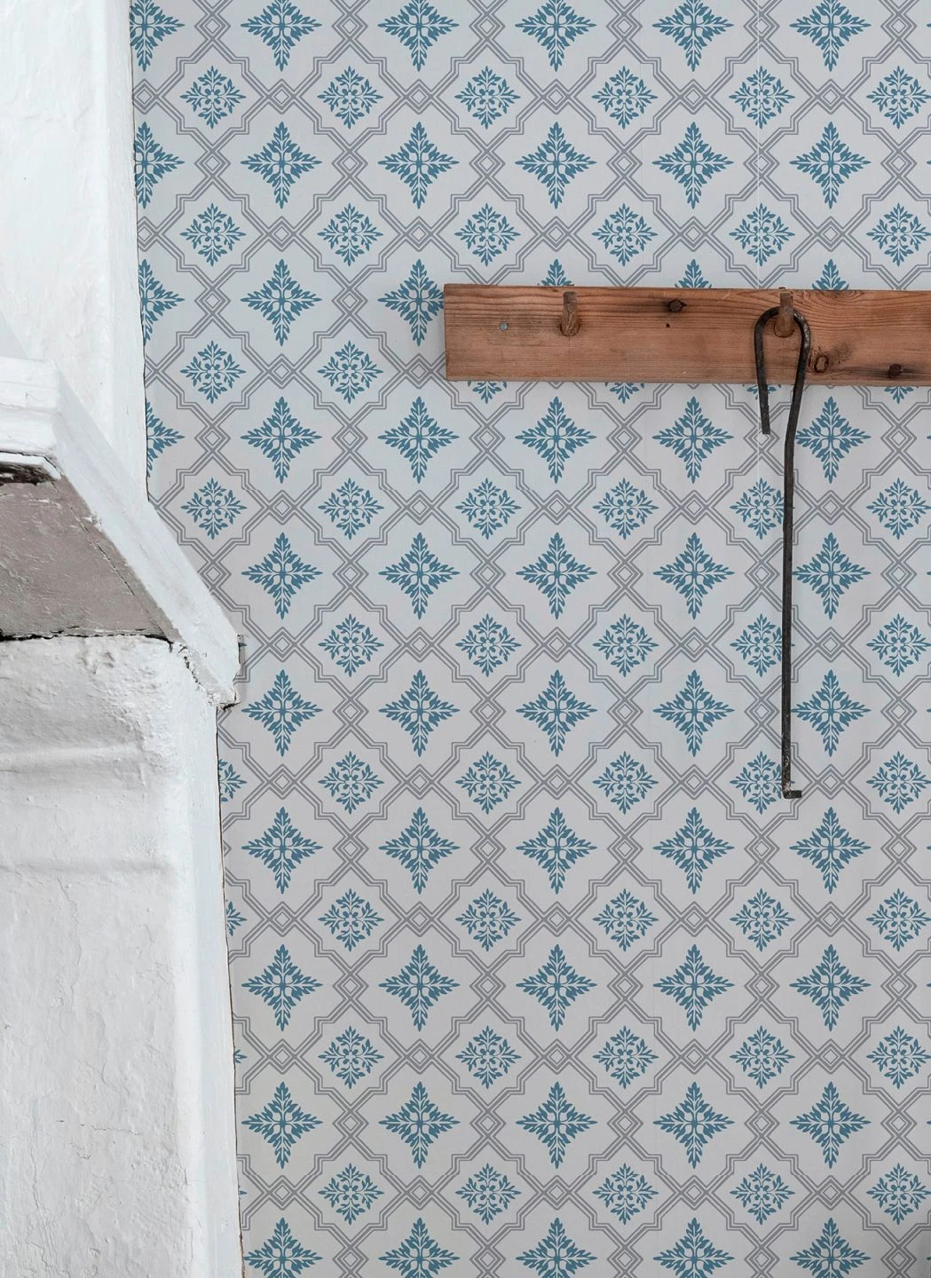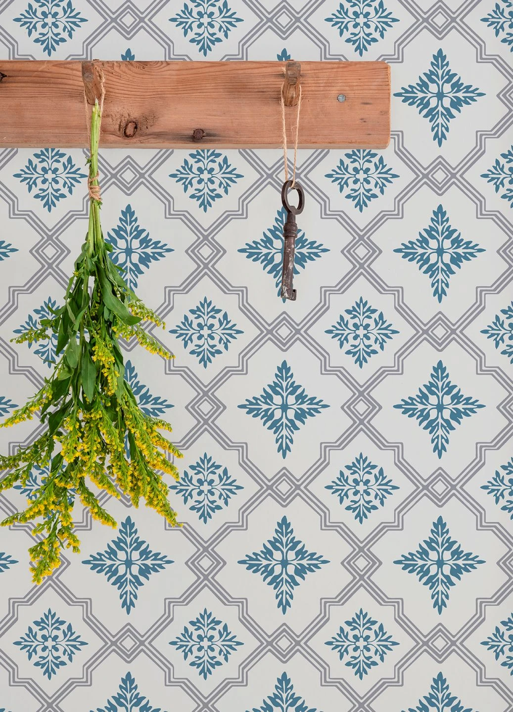 An traditionelle, spanische Landhaus-Motivfliesen angelehnt, erstrahlt dieses Ornamentmuster in Blautönen auf weißem Grund. Man fühlt sich sofort geborgen und denkt vielleicht ein bisschen an die eigene Kindheit bei den Großeltern auf dem Land. Die Unbeschwertheit von Sommertagen mit der Familie schwingt in dieser Designtapete mit.