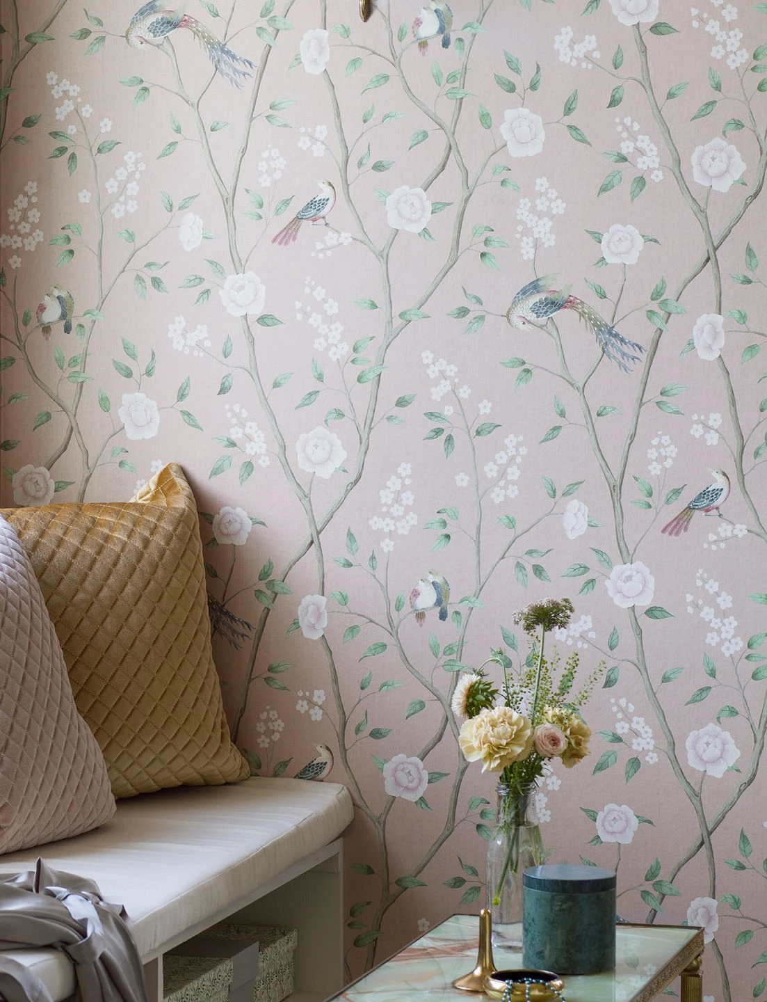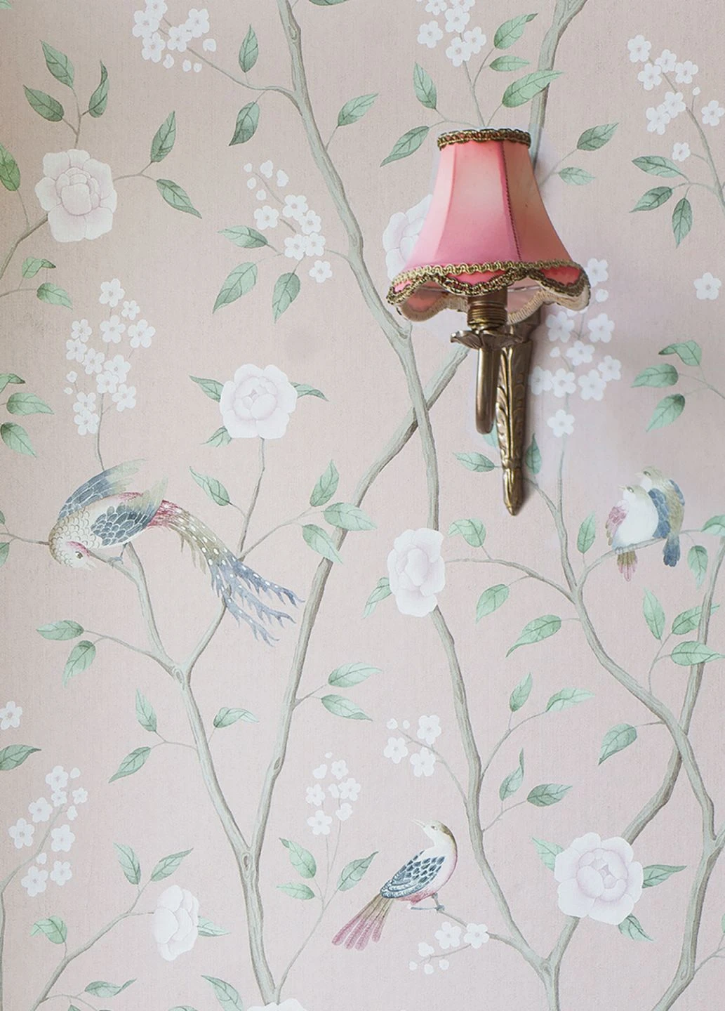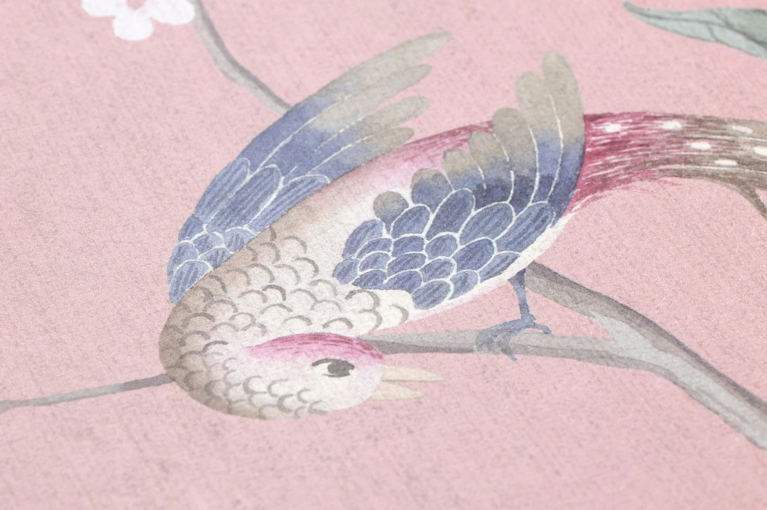 Sanfte, helle Farben und eine aquarellartig anmutende Maltechnik wirken zusammen für den unglaublich leichten, beschwingten Eindruck dieser Vliestapete. Auf dem Grund in der Farbe blassen Rosenholzes sitzen auf Blütenzweigen verschiedene Vögel mit zart pastellviolett, weiß und pastellblau gefärbtem Gefieder. Die orientalisch anmutende Tapete bringt frühlingshafte Atmosphäre mit einem Hauch von Exotik in Ihre vier Wände.