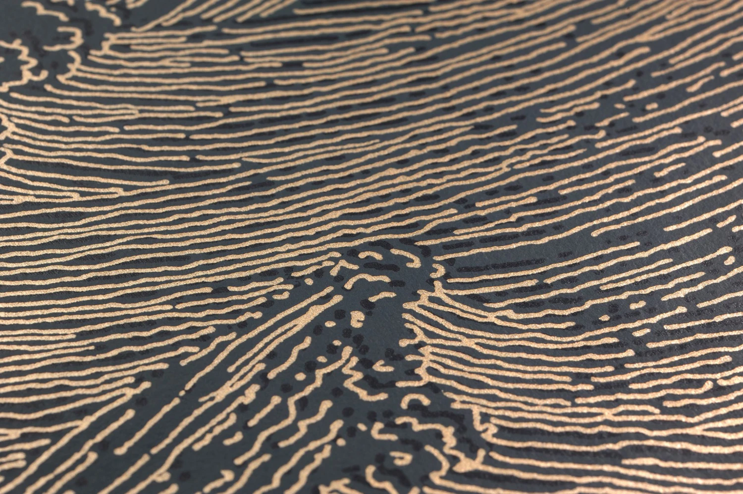 Wellen ganz aus goldenen und schwarzen Linien und Punkten auf dunklem Anthrazit erwecken den Eindruck des vom Wind bewegten Ozeans in der Dunkelheit der Nacht, in der nur das Licht des Mondes für Reflexe sorgt. Das Auf und Ab der Wellen, die wie ein Kupferstich wirken, erinnert an klassische asiatische Kunst und verleiht Ihrem Raum ein kostbares Angesicht. Der geschickte Einsatz von Licht – ob von Fenstern oder aus künstlichen Lichtquellen – erweckt die Goldfarbe der Wellen zum Leben.