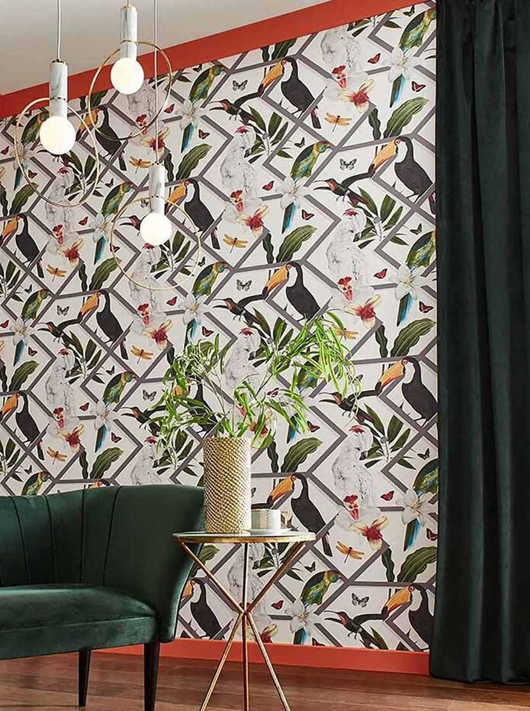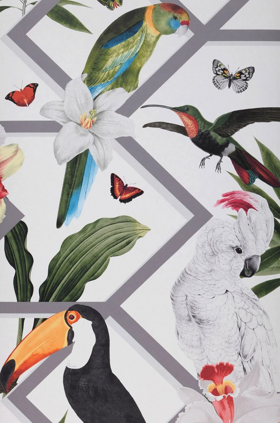 Ein modernes Tropic Art Deco Muster präsentiert sich auf Tapete Linda. Das Who is Who der Paradiesvögel gibt sich hier ein Stelldichein vor graphischem Design: Tukane, Kolibris und Papageien sind in anmutiger Schönheit versammelt. Wer es ausgefallen liebt, wird an Linda seine wahre Freude haben.