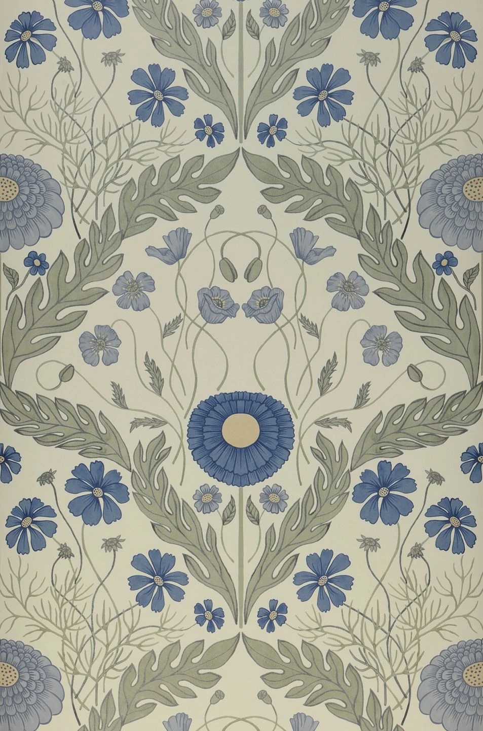 Blaue Blumen symbolisieren Romantik, Sehnsucht und Unendlichkeit. Verschiedenartige Blütenformen und Blätter bilden florale Ornamente, die mit Leichtigkeit schwingen. Die feinfühlige Designtapete in Blautönen, Beige und Grünweiß mit abwaschbarer Oberfläche ist eine moderne frische Version des Blumenbarock.