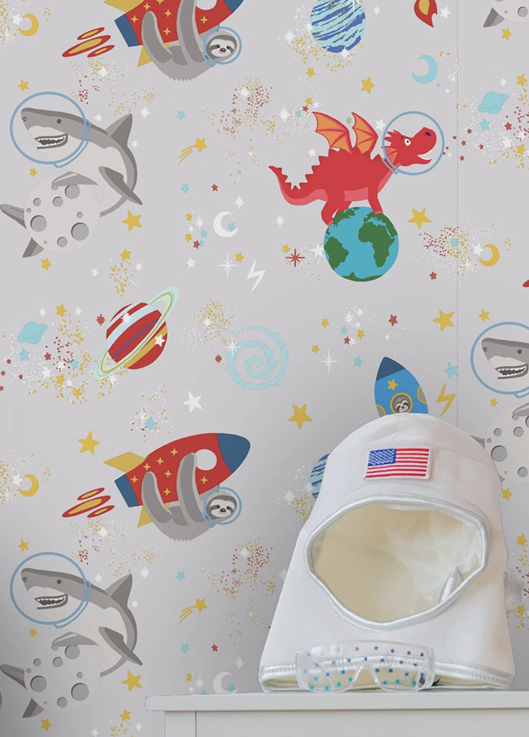 Drachen, Haifische und Pandabären haben sich in die Galaxie verirrt und spielen mit den Planeten oder nutzen Raketen für die Fortbewegung im Universum. Du kannst Dich ihnen anschließen und Abenteuer im Weltall erleben. Herrlich bunte Farben unterstreichen die fantasievolle Ausstrahlung.