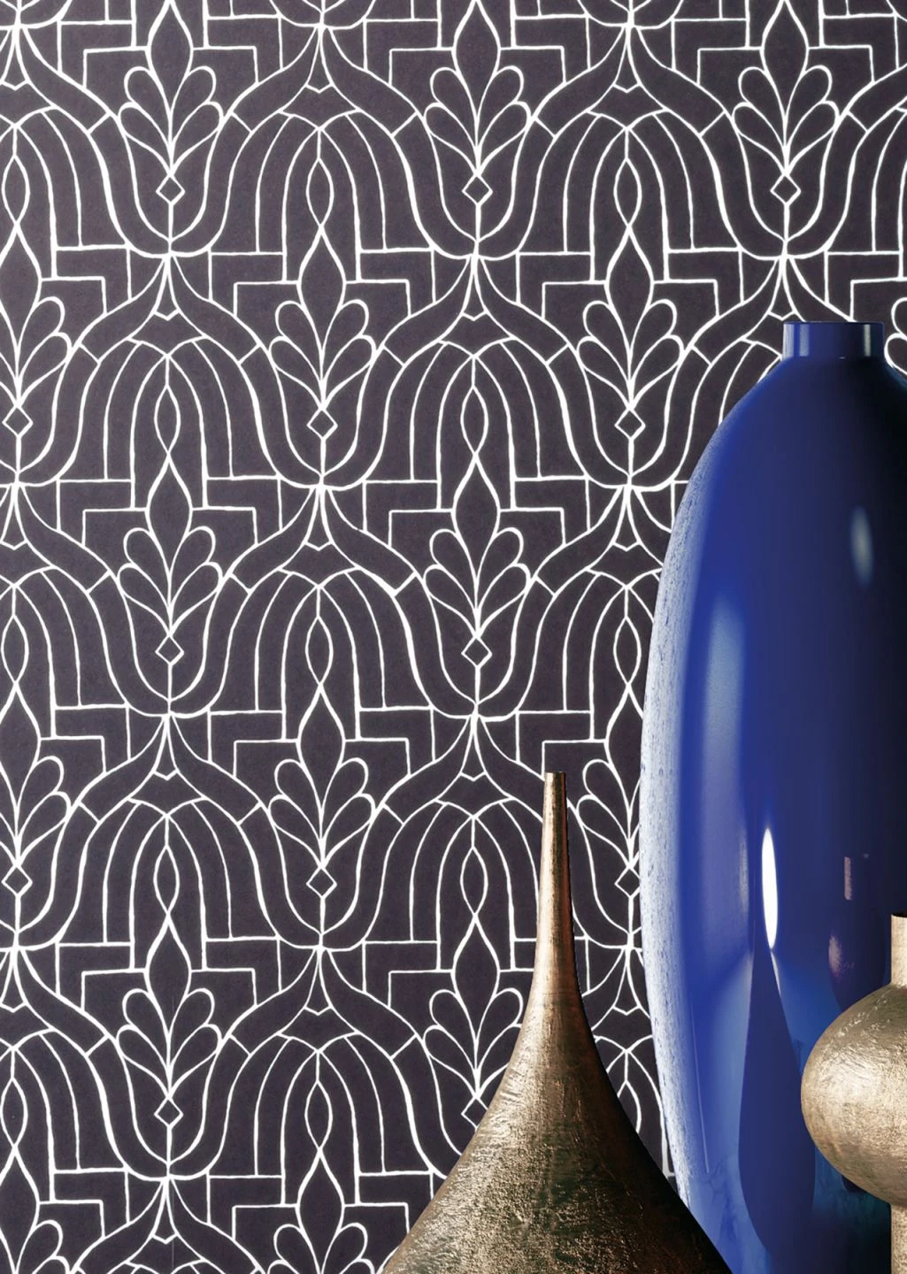 Nur angedeutet durch fühlbare weiße Linien auf dem schwarzen Untergrund dieser Vliestapete, entstehen orientalische Ornamente. Der Verlauf der Linien, ob parallel oder aufeinander zu, in geschwungenen Bögen oder als gerade Strecken, scheint die Kuppeln märchenhafter Gebäude, stilisierte Bäume oder Fächer aus Pfauenfedern zu bilden. Durch den unterschiedlich starken Farbauftrag der leicht erhabenen weißen Musterfarbe wirkt die Tapete wie ein kostbares handgearbeitetes Unikat.