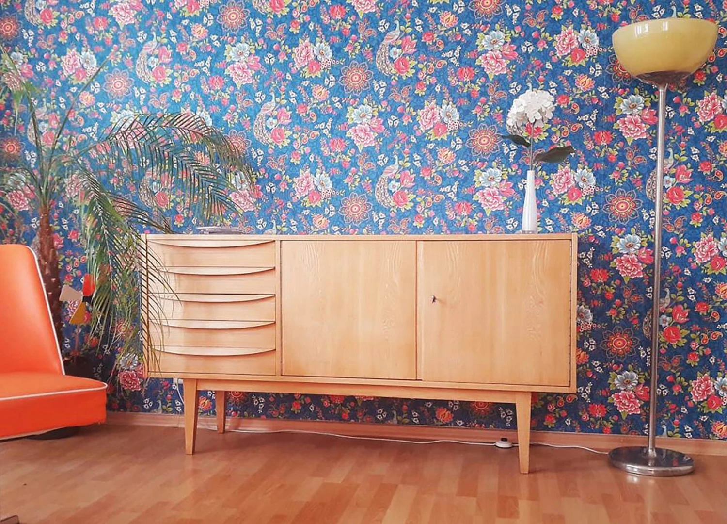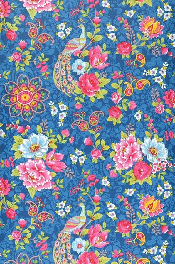Erlesene Blumenarrangements, dazwischen prachtvolle Pfauen, das zeugt von erlesenem Geschmack. Blau überzeugt hier als Grundfarbe dieser beliebten floralen Tapete.