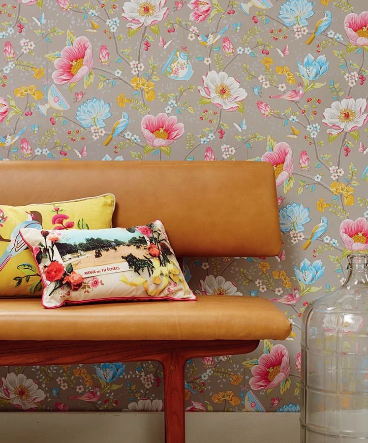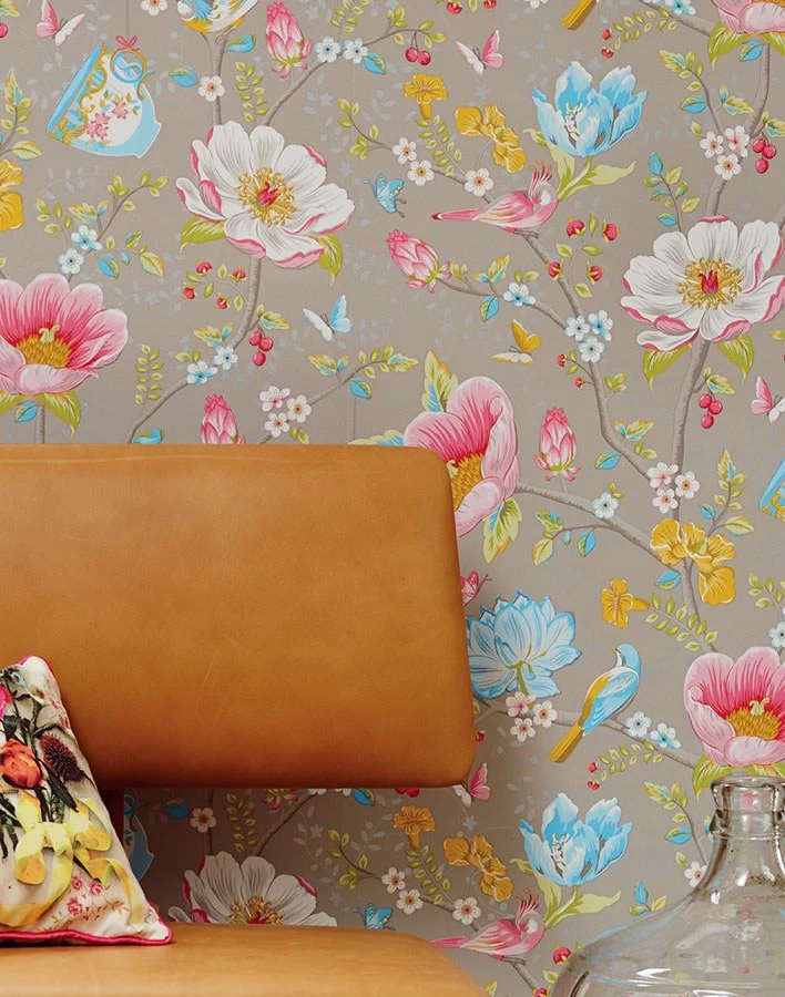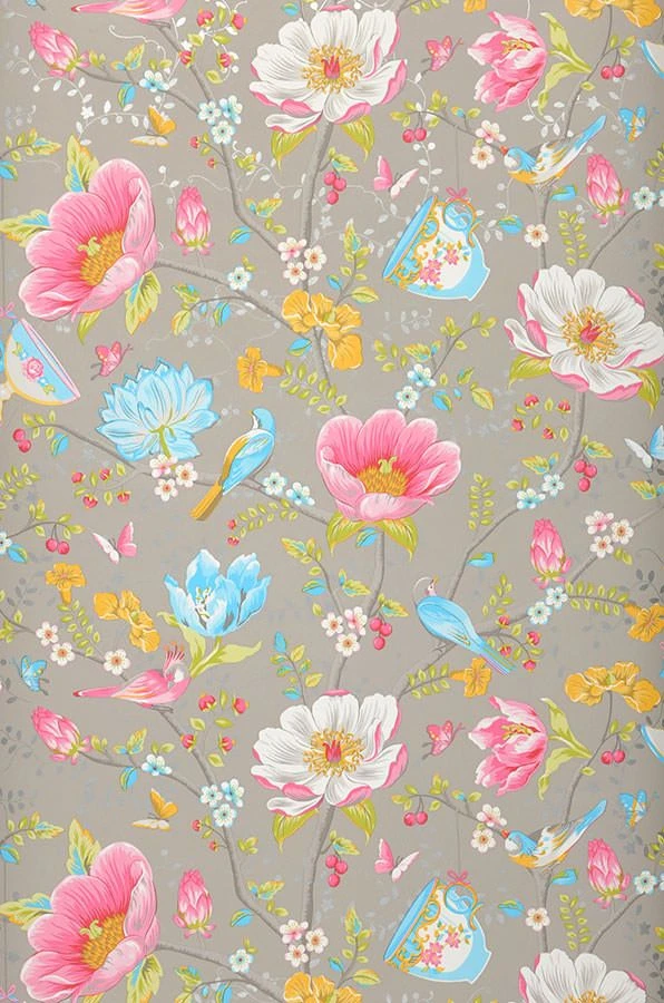 Zwischen der blumigen Vielfalt hängen Tassen an Zweigen, kleine Vögel und Schmetterlinge bewundern die Farbenpracht. Wer würde sich in dieser beigen Fantasiewelt nicht wohl fühlen?