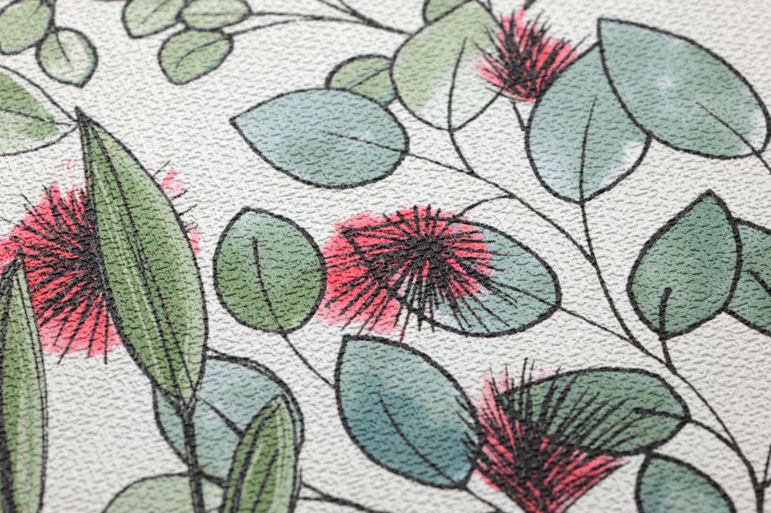 Die Blätter in verschiedenen Grüntönen wirken mit ihren schwarzen Umrisslinien wie im Comic-Stil gezeichnet. Rote büschelartige Blüten leuchten aus dem Dschungel der Blätter hervor und erinnern an die exotischen Formen tropischer Pflanzen. Das Vinyl der Oberfläche hat eine textilähnliche Struktur wie ein gewebter Stoff und erlaubt es, die Tapete sogar im Badezimmer einzusetzen. Ebenso kann sie problemlos feucht gereinigt werden.
