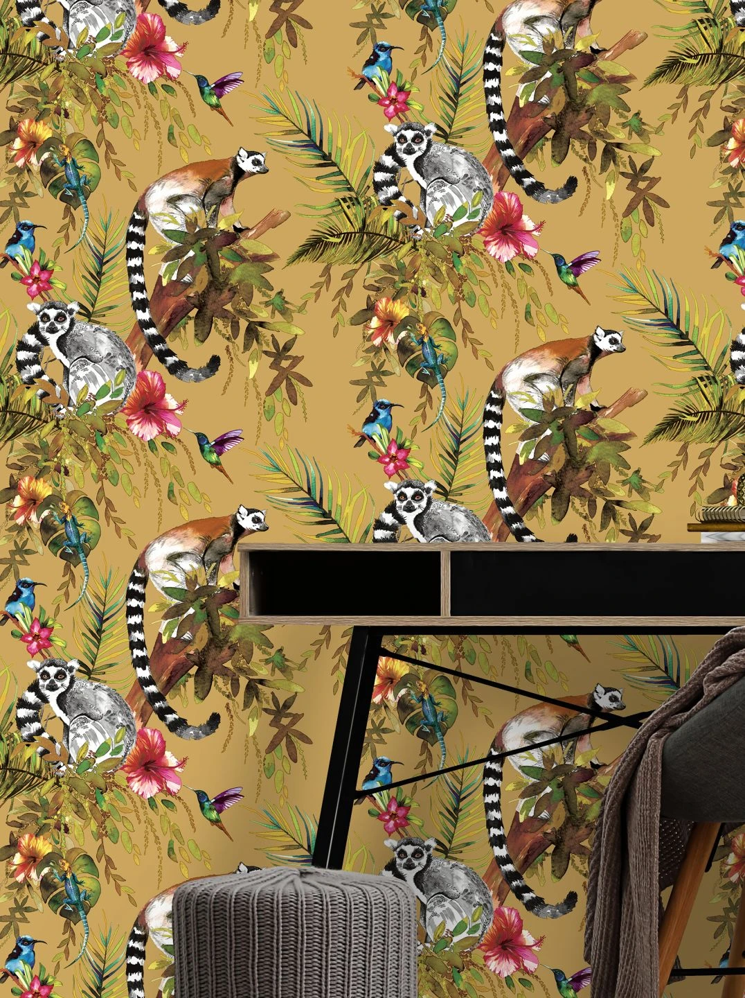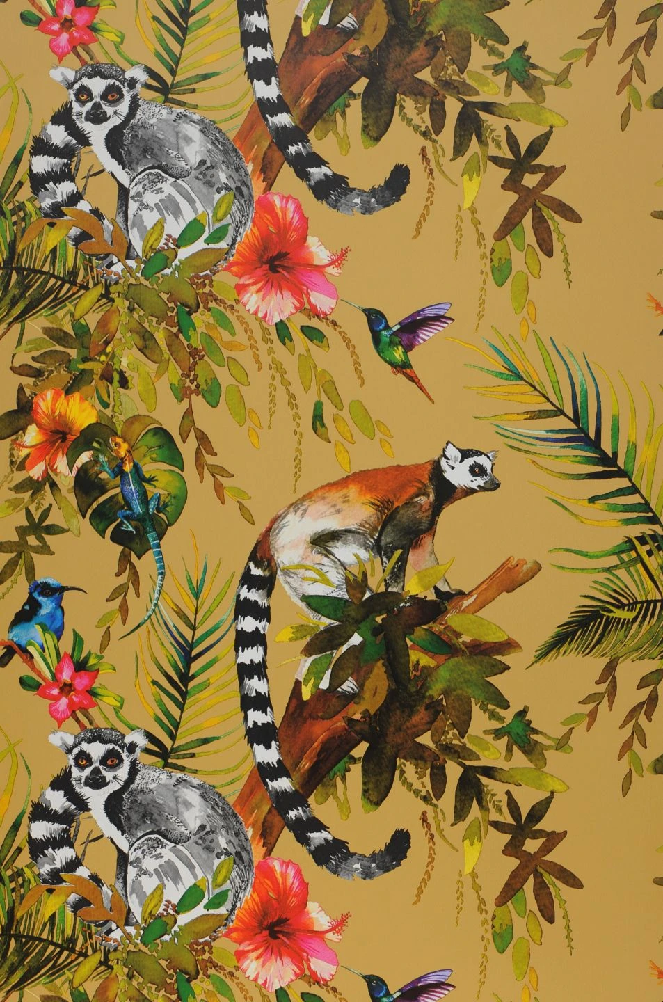 Mit der farbenprächtigen Papiertapete Madagascar erwecken Sie in Ihren vier Wänden die Welt der Tropen zum Leben. Auf dem sonnig-sandgelben Grund, zwischen exotischen Blättern und Blüten, sitzen niedliche Kattas wie kuschelige Plüschtiere, zierliche Kolibris schwirren von Blüte zu Blüte, und bunte Echsen ruhen auf den kräftigen tropischen Blättern. Die Tapete voller exotischem Leben entführt Sie in die Sonne und Wärme des Südens.