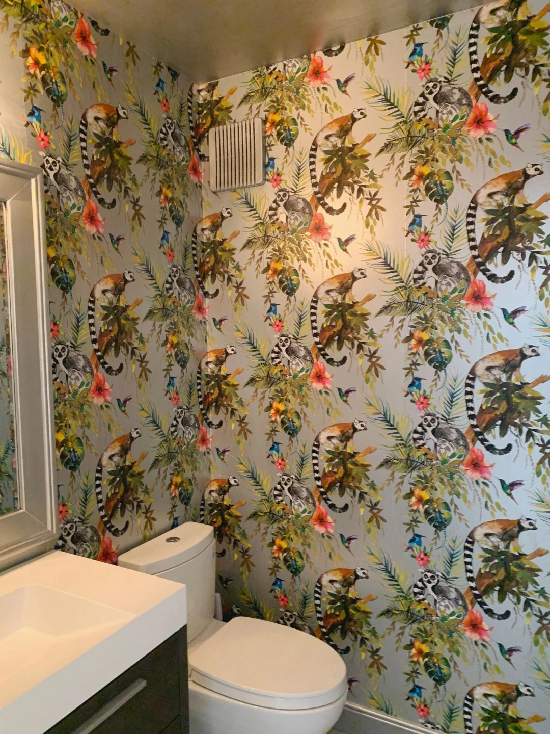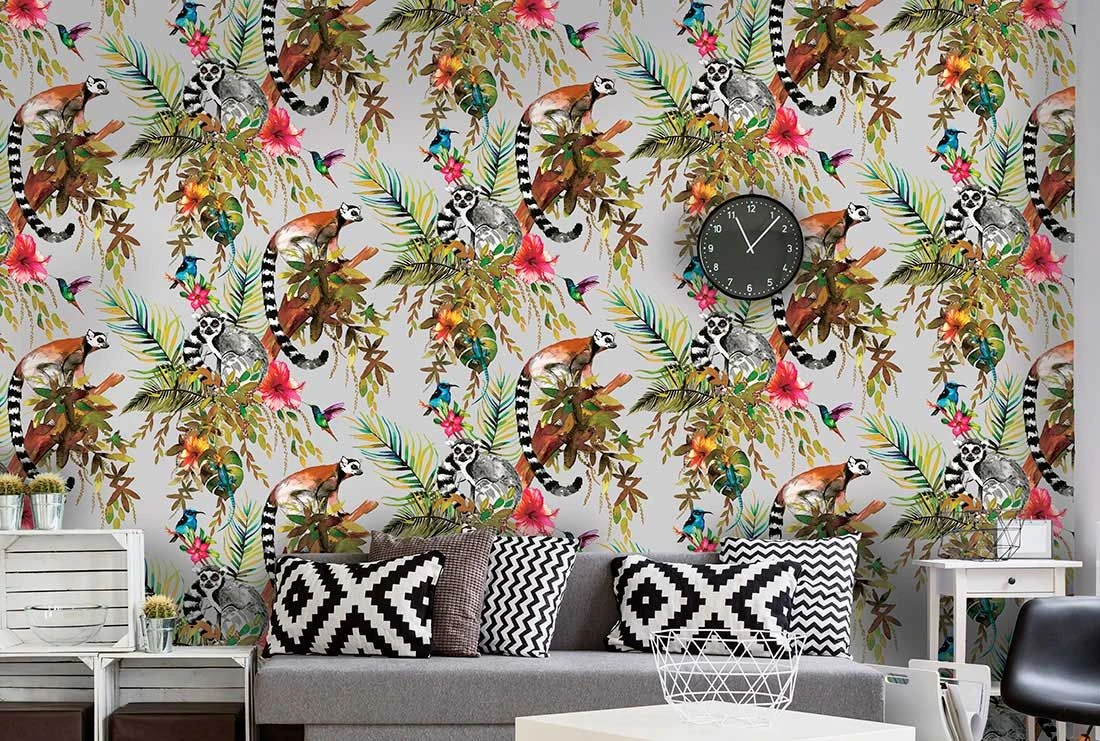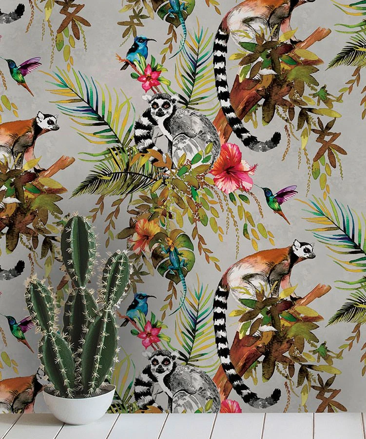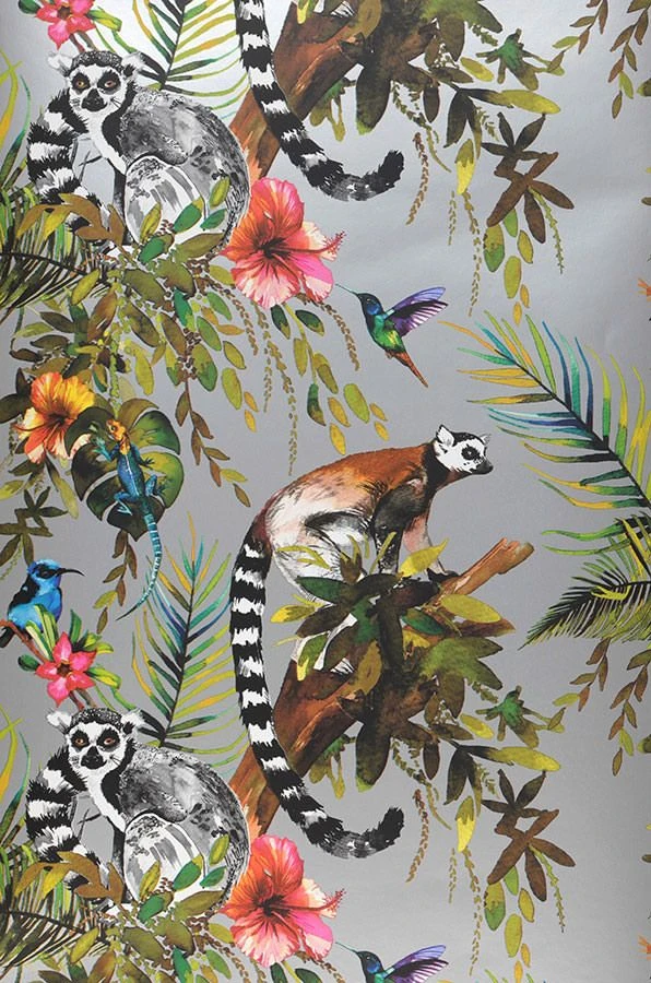 Madagaskar – Pirateninsel mit tropischem Regenwald und jeder Menge exotisch tierischer Protagonisten, die sich auf der Design Tapete der ausgefallenen Art ein Stelldichein geben. Und da dort alles ein bisschen verrückt ist, darf es auch der silberfarbene Hintergrund der Tapete sein.