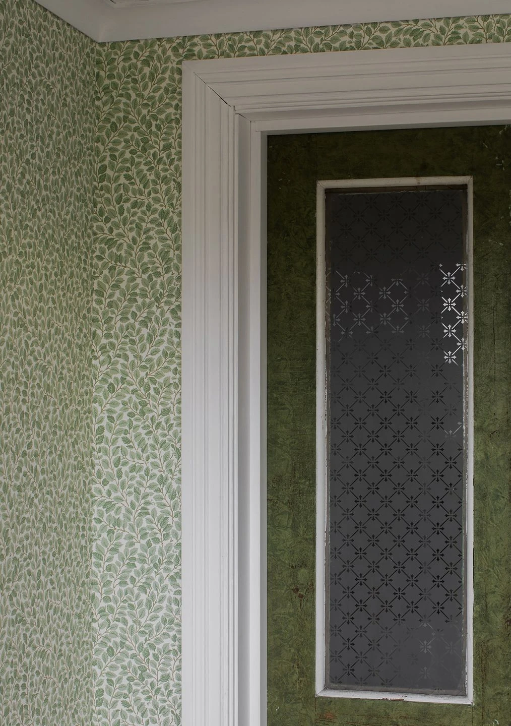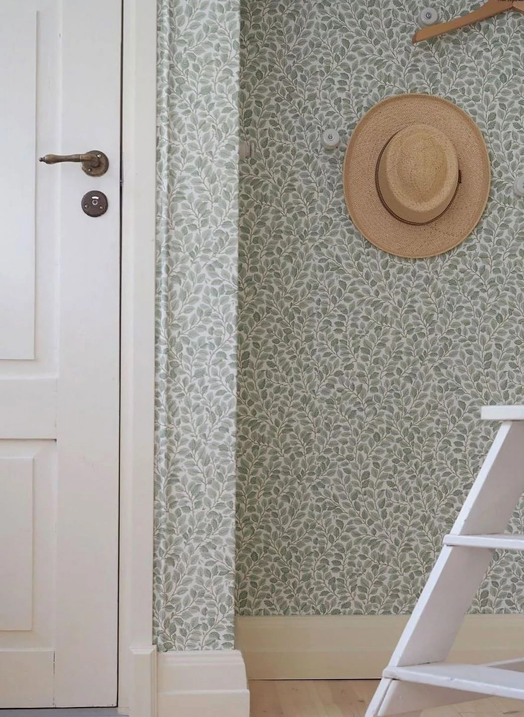 Schlanke Zweige mit zartgrünen Blättern bedecken die Tapete „Malva“ dicht an dicht. Kombiniert mit Einrichtungselementen in Weiß oder in Holztönen entfaltet sie ihre ganze gestalterische Wirkung. Die Vliestapete strahlt Leichtigkeit und Geborgenheit gleichermaßen aus und erinnert an historische, über und über mit pflanzlichen Motiven bedeckte Tapetenmuster.