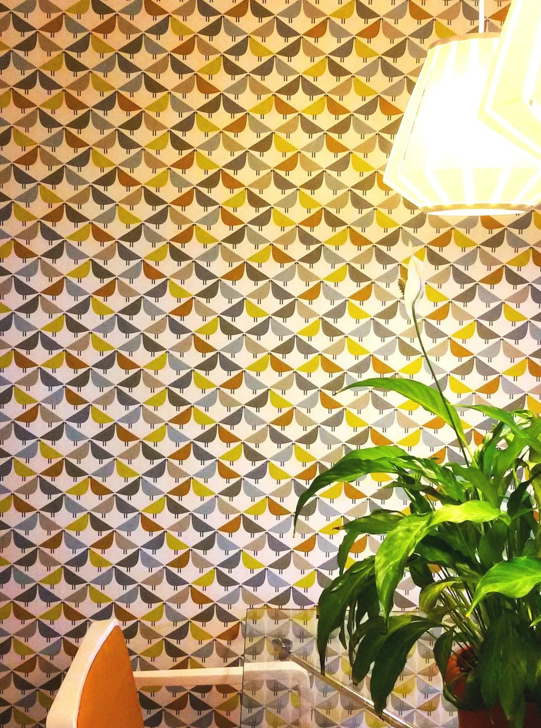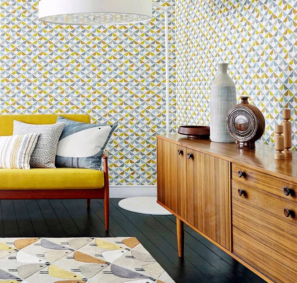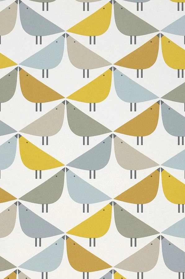 Alle Vöglein sind schon da: Auf Design Tapete Marga in stilisierter Grafik und inniger Position, die bunte Rauten formt. Ein fantastisches Muster-Highlight für den angesagten Vintage-Look, der mit warmem Holz und abgestimmten Textilien die Herzen aller Retrofans höher schlagen lässt.