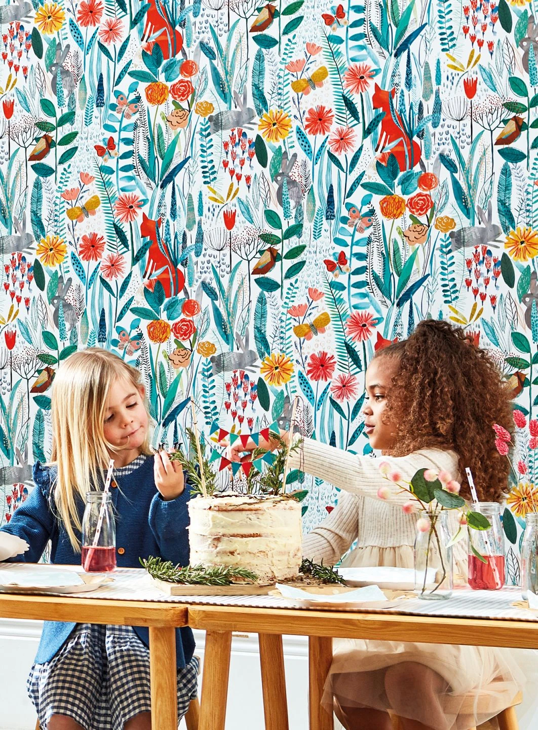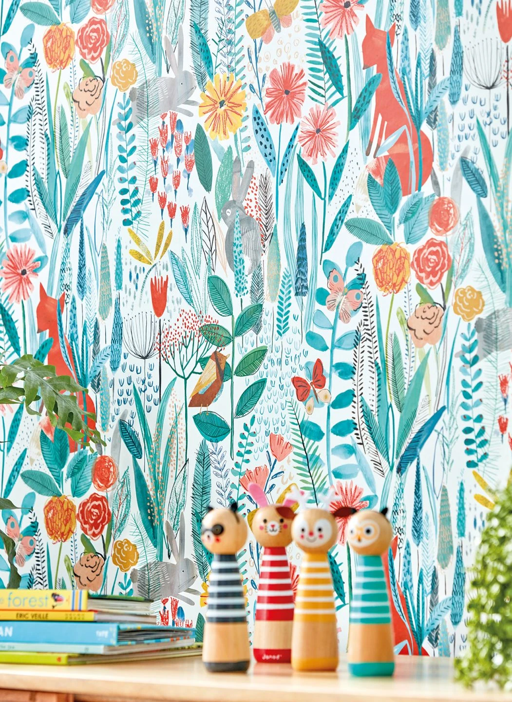 Auf dieser Vliestapete fürs Kinderzimmer gibt es viel zu entdecken: eine phantasievolle Blumenwiese wie mit Farben aus dem Tuschkasten an die Wände gemalt. Zwischen den Blüten in leuchtenden Rot- und Gelbtönen verbergen sich Füchse, Hasen, Vögel und bunte Schmetterlinge. So wird es im Kinderzimmer ganz bestimmt nicht langweilig!