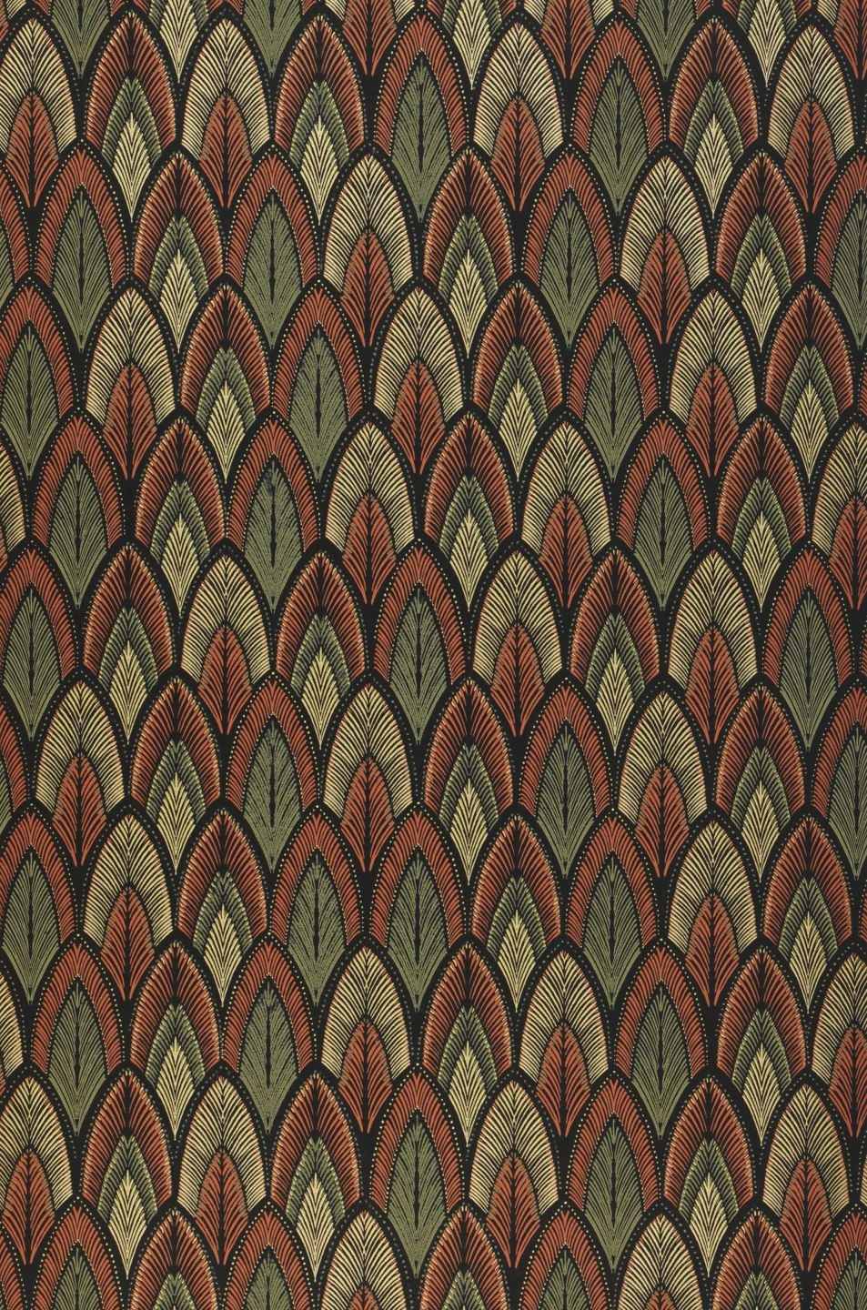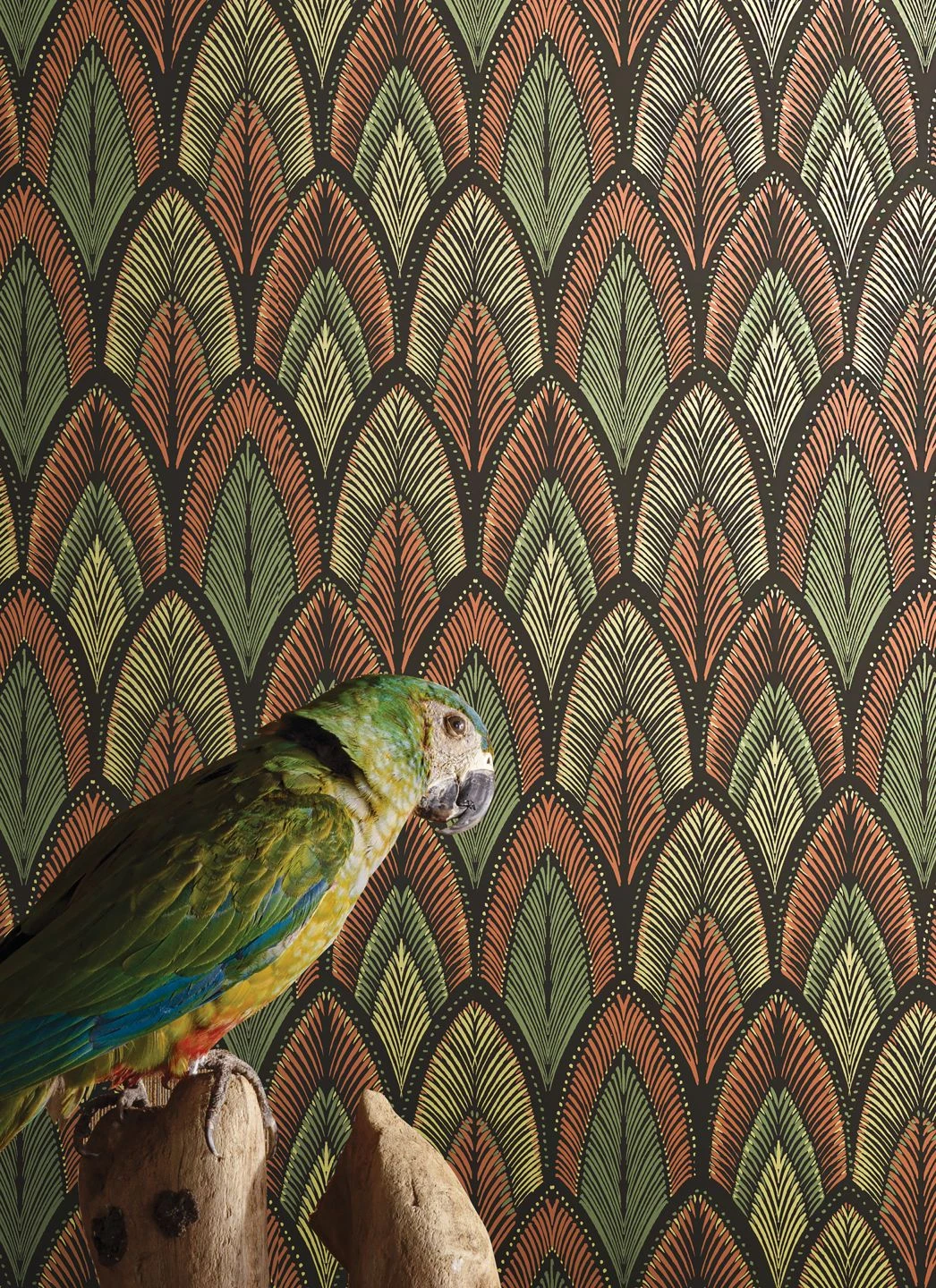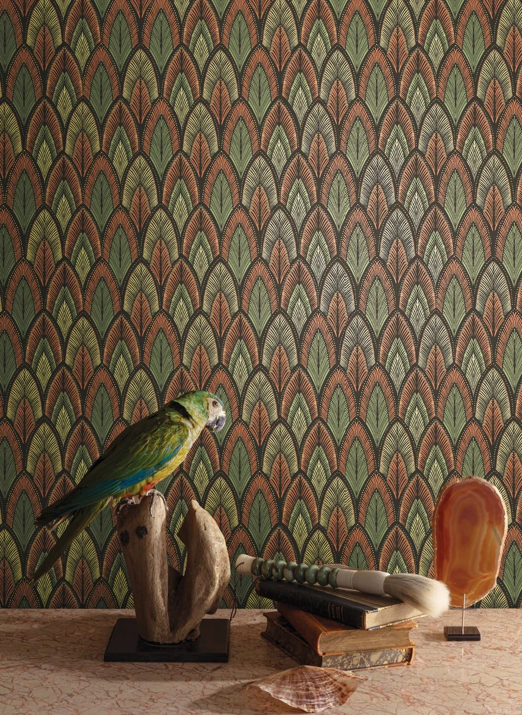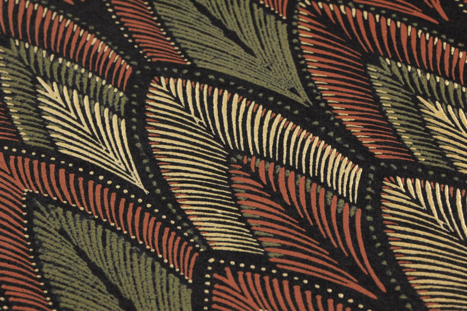 Eine faszinierende Wand aus stilisierten Blättern, die nur aus feinen Linien und Punkten gemacht sind, strahlt naturnahe Geborgenheit aus. Das angenehme Kupferbraun in Verbindung mit Gold und Schilfgrün gibt Wärme und einen Hauch von Eleganz hinzu. Fertig ist eine außergewöhnliche Tapete, die an die Formensprache des Art Deco erinnert und bestens zu Möbeln in Naturtönen und mit einem ausdrucksstarken Vintage-Charakter passt.