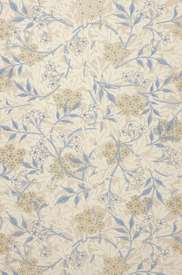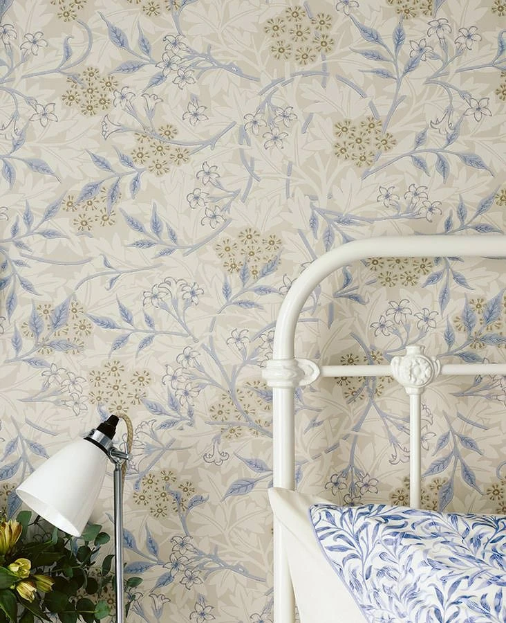 Der Entwurf dieser im Leimdruckverfahren hergestellten Papiertapete geht auf den britischen Künstler und Designer William Morris zurück. Zarte Blüten und Blätter in Cremeweiß, Olivgelb und Pastellblau schlingen sich umeinander auf dem hellgraubeigefarbenen Untergrund. Die perfekte Abstimmung der Farben macht die Tapete zu einem ästhetischen Genuss. Helle oder weiße Vintage-Möbel passen ideal dazu.