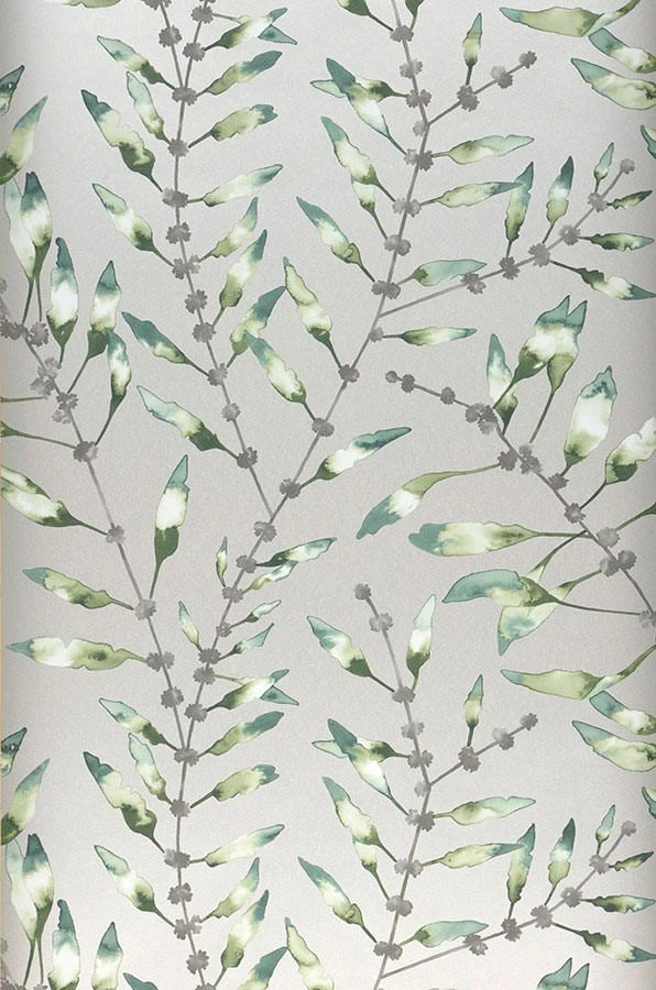 Farbabstufungen, Verläufe, Hell-Dunkel-Kontraste lassen die grünen Blätter an umbragrauen Zweigen auf Design Tapete Mathea täuschend echt erscheinen. Der aluminiumweiße Tapetengrund verleiht das Plus an magischer Tiefe. Lassen Sie sich umgarnen von dieser natürlichen Schönheit, die sich kunstvoll Ihrer Raumgestaltung anpasst.