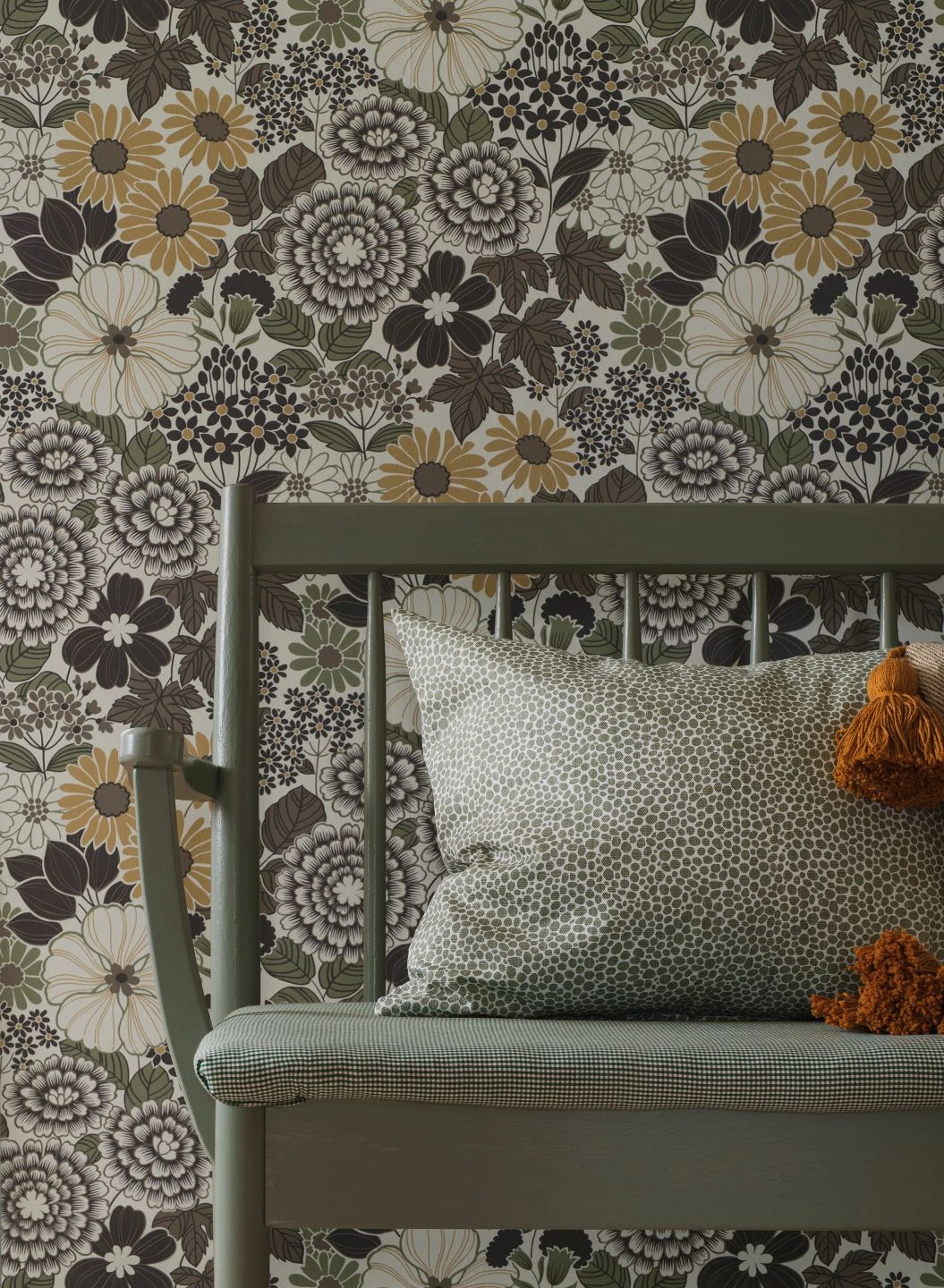 Blumen in allen erdenklichen Formen, teils mit zierlichen, noch geschlossenen Knospen, teils bereits voll erblüht, bedecken Ihre Wände wie ein dicht bepflanztes Beet im Garten. Der Formenvielfalt ihrer Blüten setzen die ruhigen, gedeckten Erdfarben der Blumen und das Schilfgrün der Blätter einen ästhetischen Kontrapunkt entgegen. Indem Sie eine der Farben für die Einrichtung herausgreifen, unterstreichen Sie die Wirkung der Tapete gekonnt.