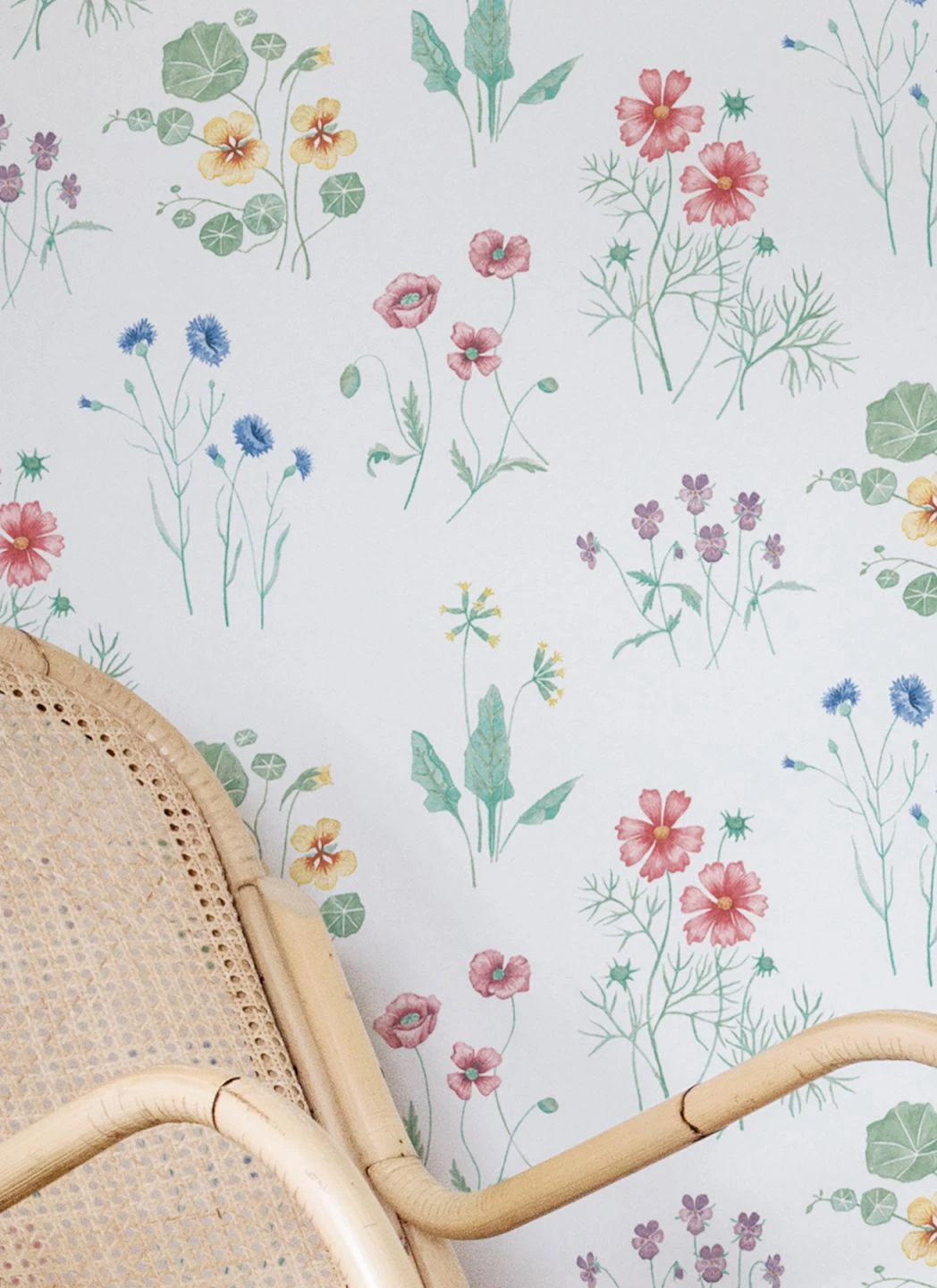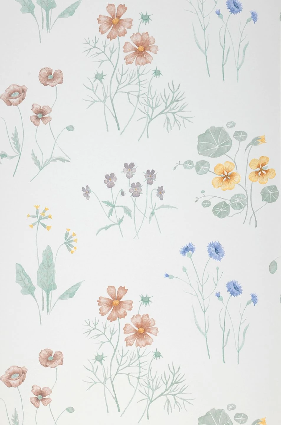 Blaue Kornblumen mit ihren schmalen Blütenblättern, roter Klatschmohn, leuchtend orangegelbe Kapuzinerkresse, blauviolette Veilchen und Cosmea mit ihren feingliedrigen Blättern schaffen eine luftige, sommerliche Atmosphäre in Ihren vier Wänden. Die zarten, aquarellähnlichen Abbildungen der Blumen sind realitätsgetreu und voller schöner Details. Auf dem weißen Grund wirken die Blüten besonders zart.