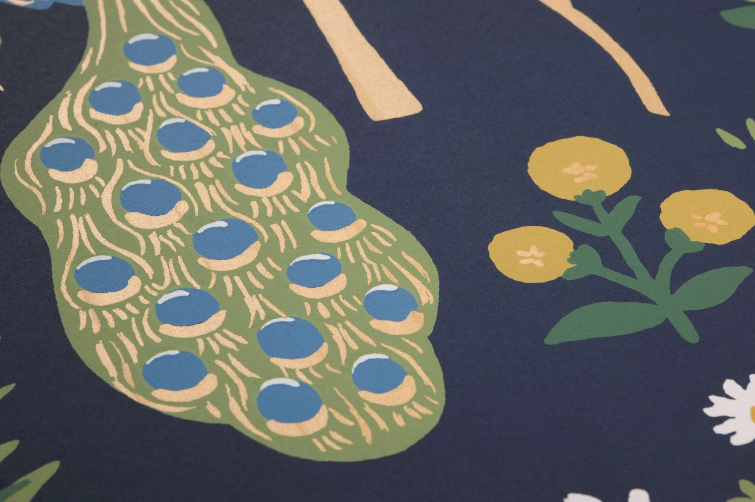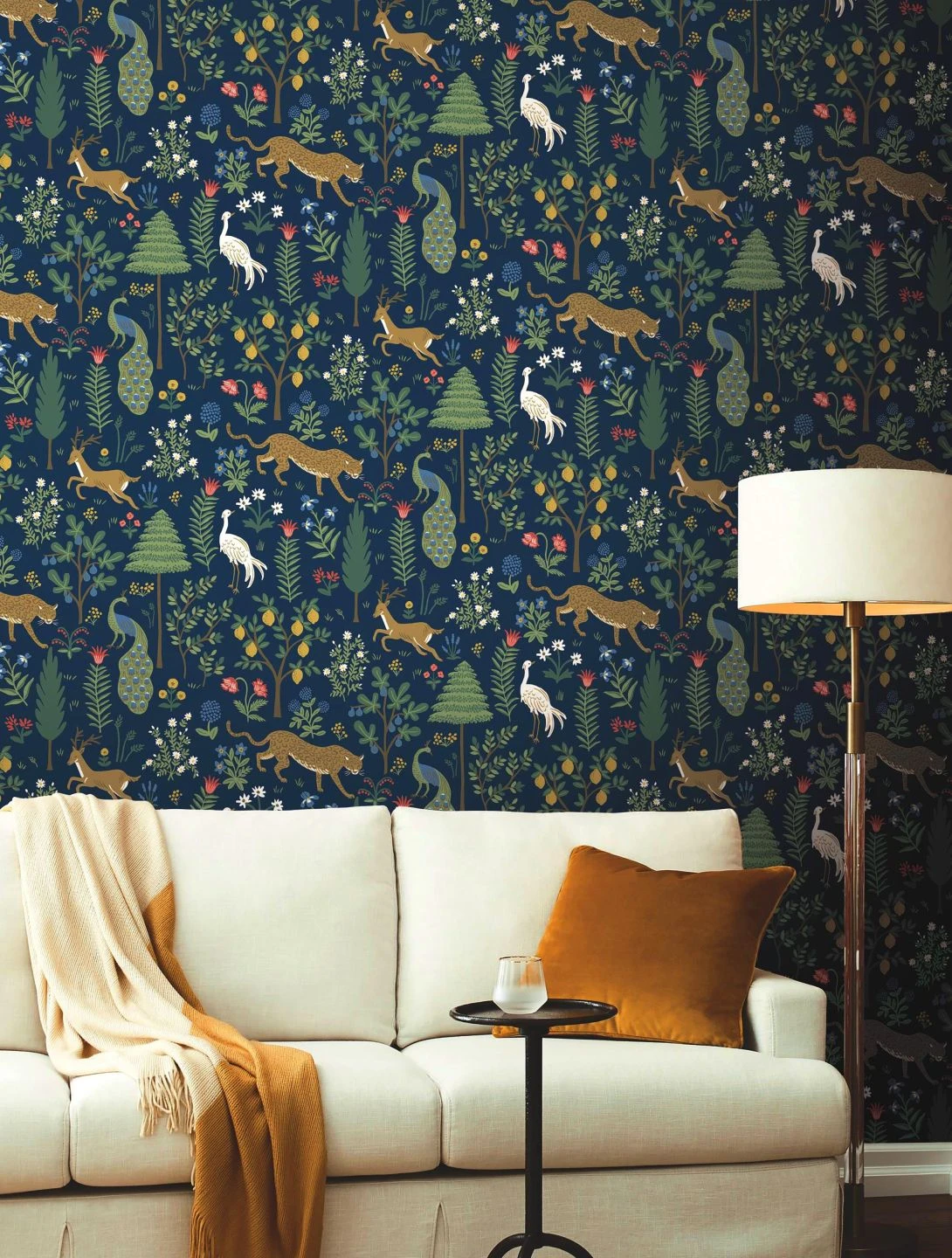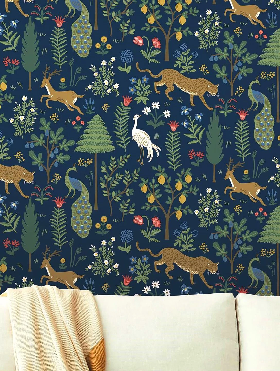 Eine Tapete voller Leben und mit viel Herz hat Rifle Paper mit Menagerie geschaffen. Blumen blühen in allen Farben, Nadel- und Laubbäume, Obstbäume voller reifer Früchte und Sträucher bilden einen lockeren Wald. Darin leben Kraniche und Pfauen, Hirsche und Leoparden in einem friedlichen Miteinander. Eine liebevoll gemalte, paradiesische Utopie, zugleich schön anzusehen und eine Einladung, den Blick schweifen zu lassen.