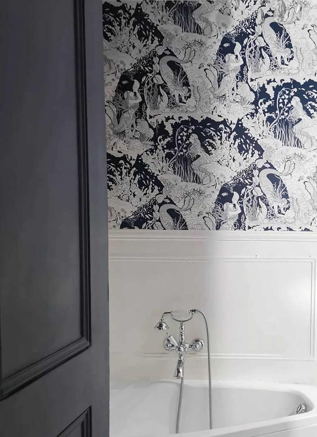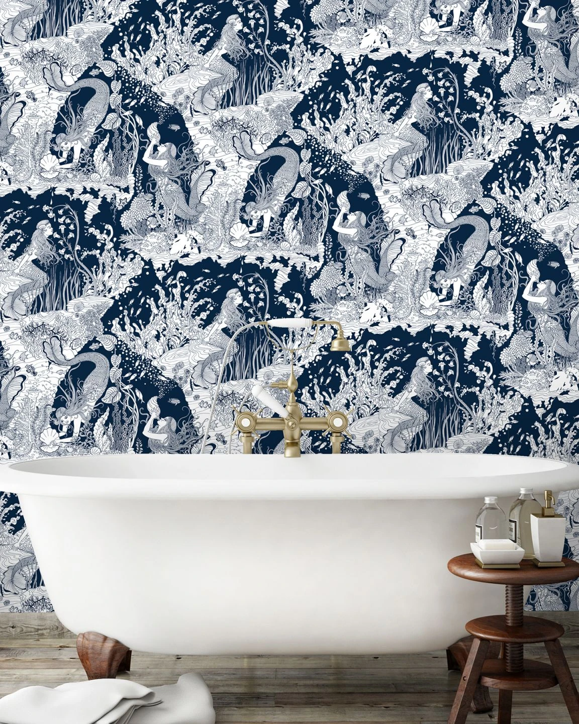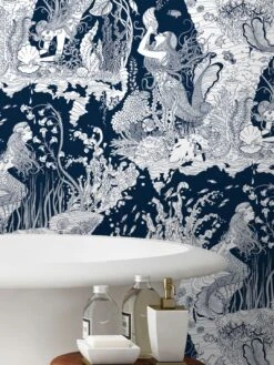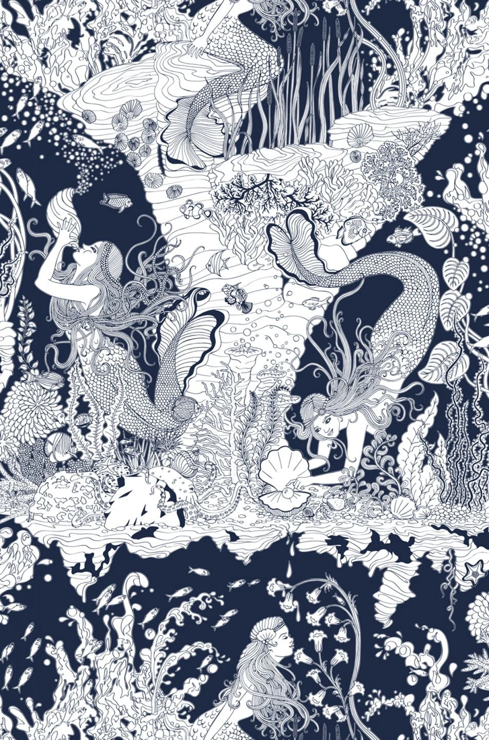 Die Legende der reizenden Meerjungfrauen beschäftigte schon viele Jugendstilkünstler, darunter Gustav Klimt oder Heinrich Vogeler. Von den einzigartigen Originalen zu einem neuen Musterbild inspiriert, hat die englische Tapetenmanufaktur Dupenny dieses detailgetreue und verführerische Design umgesetzt. Die Farbkombination aus Dunkelblau und Cremweiß stützt die magische Optik.
