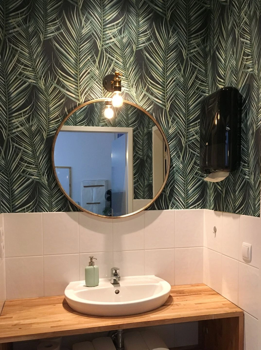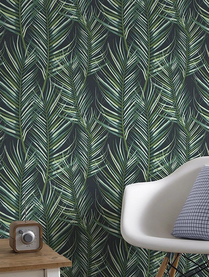 Das dichte Zusammenspiel der Palmzweige auf dem dunklen Grund hat etwas Beschützendes und Geheimnisvolles an sich. Durch die Blätter weht ein leiser Wind. Die beruhigende Wirkung der floralen Mustertapete schenkt Kraft und fördert den Scharfsinn. Auch in Baderäumen macht sich die waschbeständige Vliestapete wunderbar.