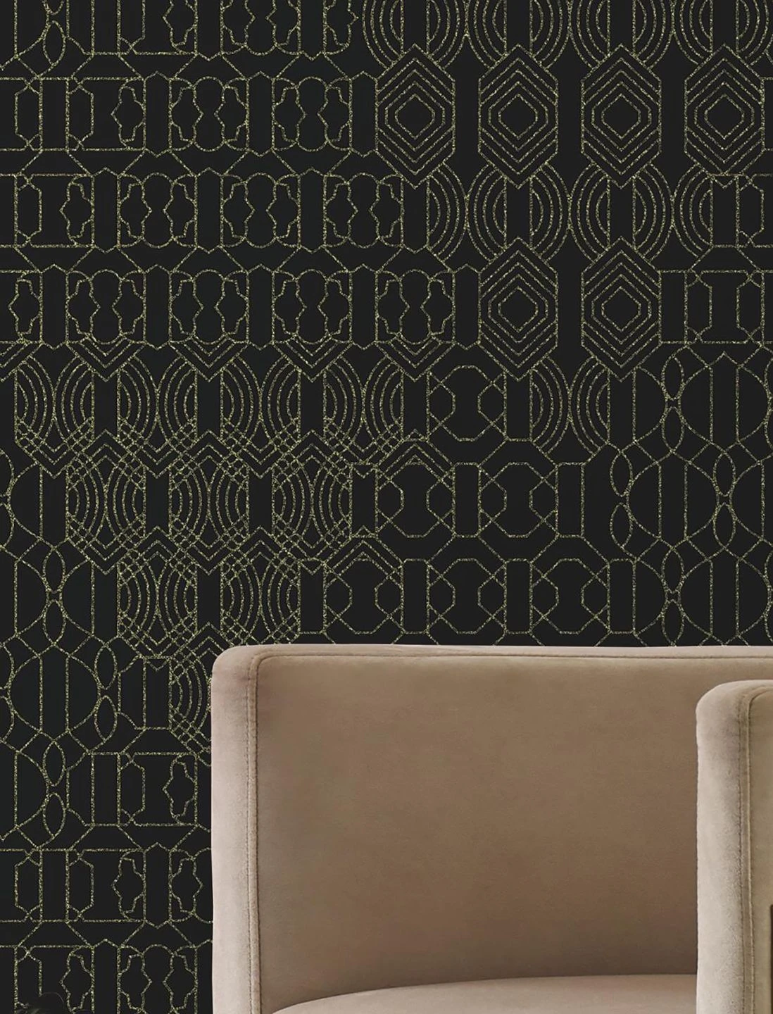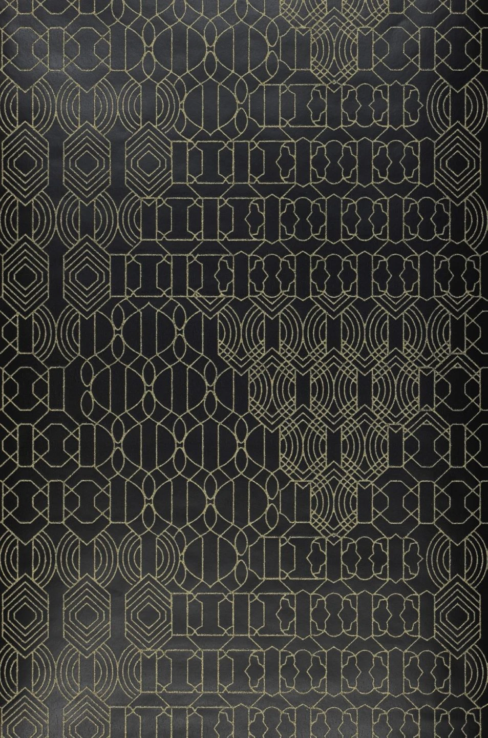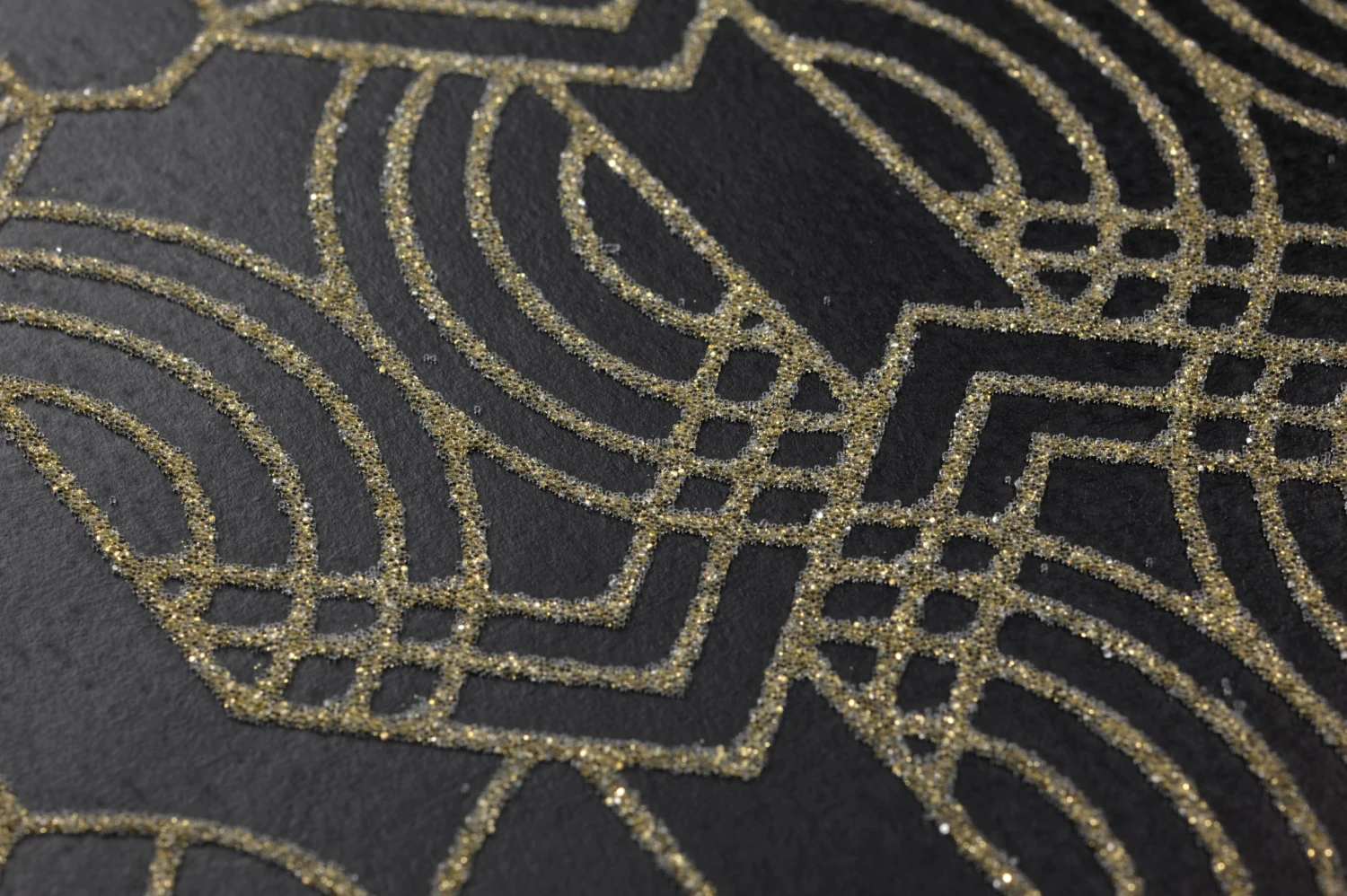 Auf dem matten schwarzen Grund entsteht ein feines Muster durch Linien aus unzähligen Glasperlen in schimmernd gelbgoldenem Farbton. Sie finden sich zu verschiedenen grafischen Ornamenten zusammen und bilden dadurch eine übergeordnete Struktur, die aus ein paar Schritten Entfernung besonders zur Geltung kommt. Das Funkeln und das fühlbare Relief der Glasperlen geben der außergewöhnlich luxuriösen Tapete ein märchenhaftes und gleichzeitig zeitlos-modernes Äußeres.