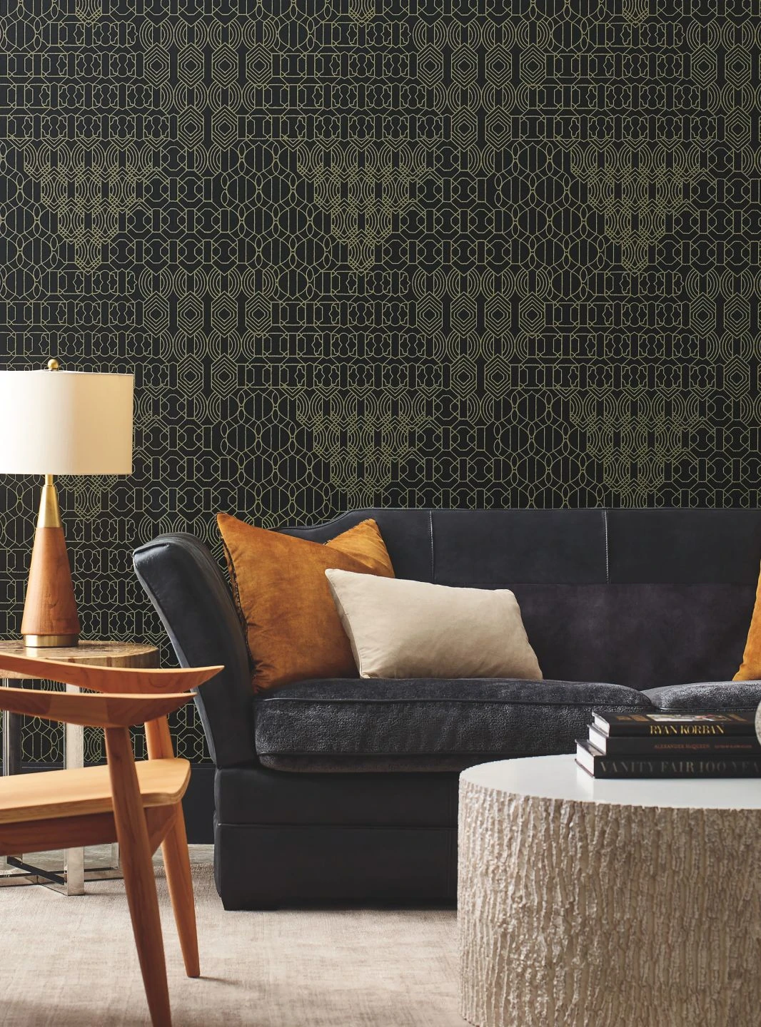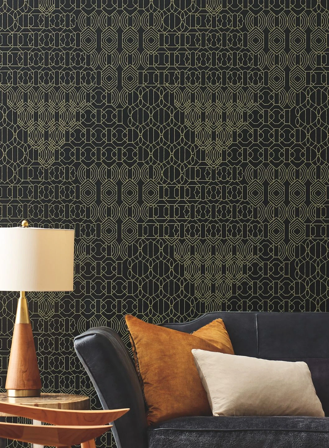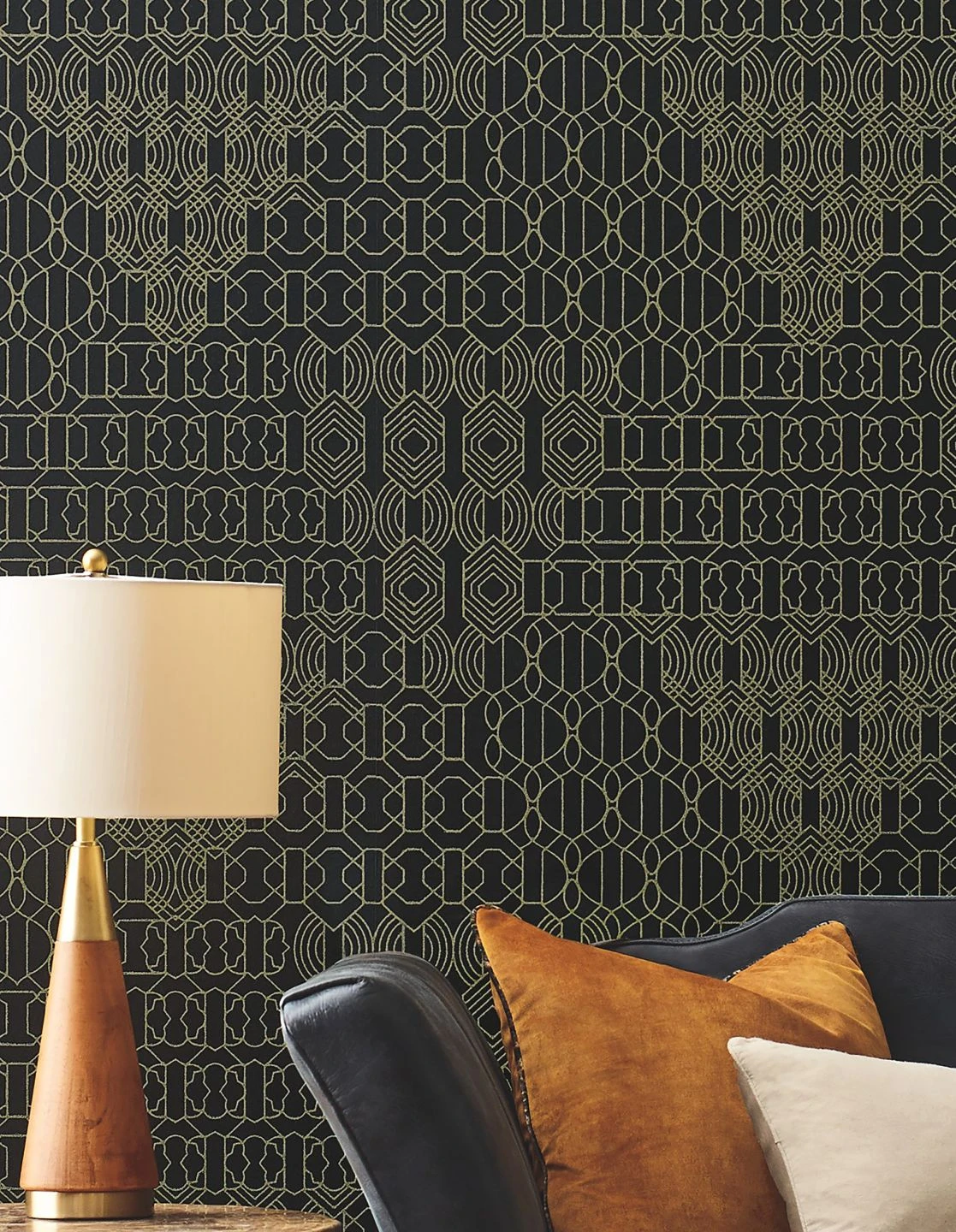 Auf dem matten schwarzen Grund entsteht ein feines Muster durch Linien aus unzähligen Glasperlen in schimmernd gelbgoldenem Farbton. Sie finden sich zu verschiedenen grafischen Ornamenten zusammen und bilden dadurch eine übergeordnete Struktur, die aus ein paar Schritten Entfernung besonders zur Geltung kommt. Das Funkeln und das fühlbare Relief der Glasperlen geben der außergewöhnlich luxuriösen Tapete ein märchenhaftes und gleichzeitig zeitlos-modernes Äußeres.