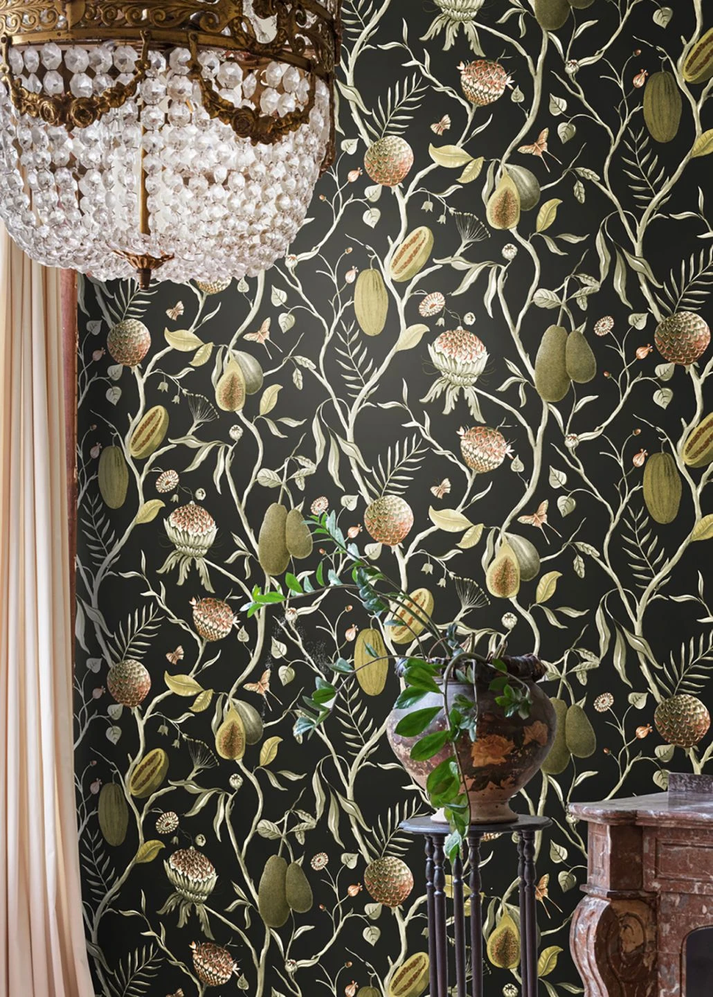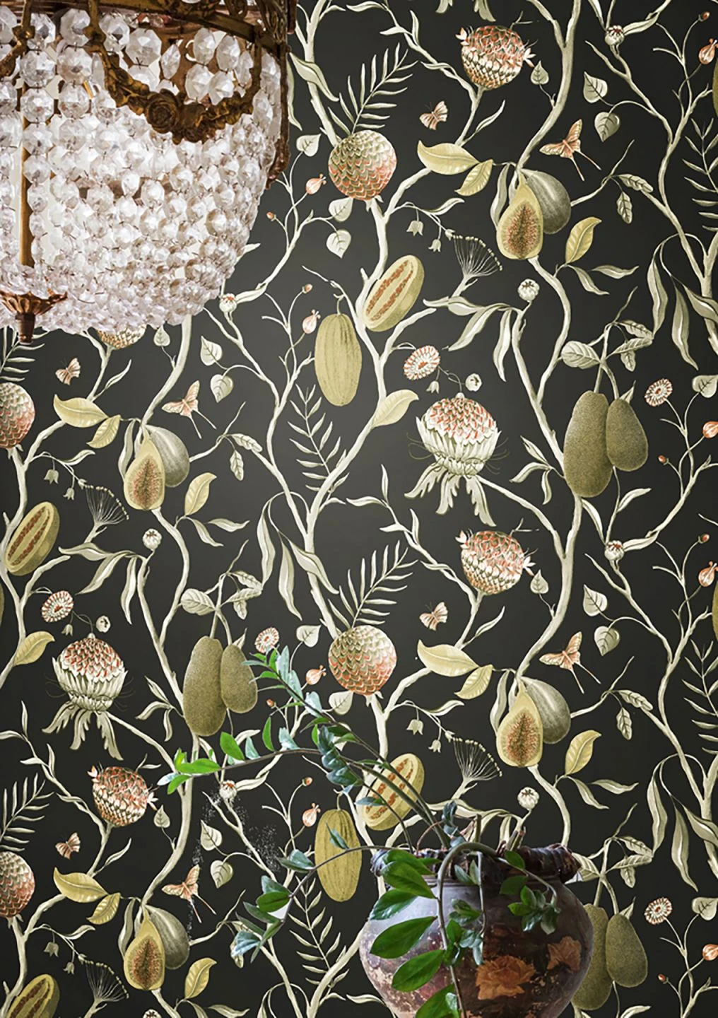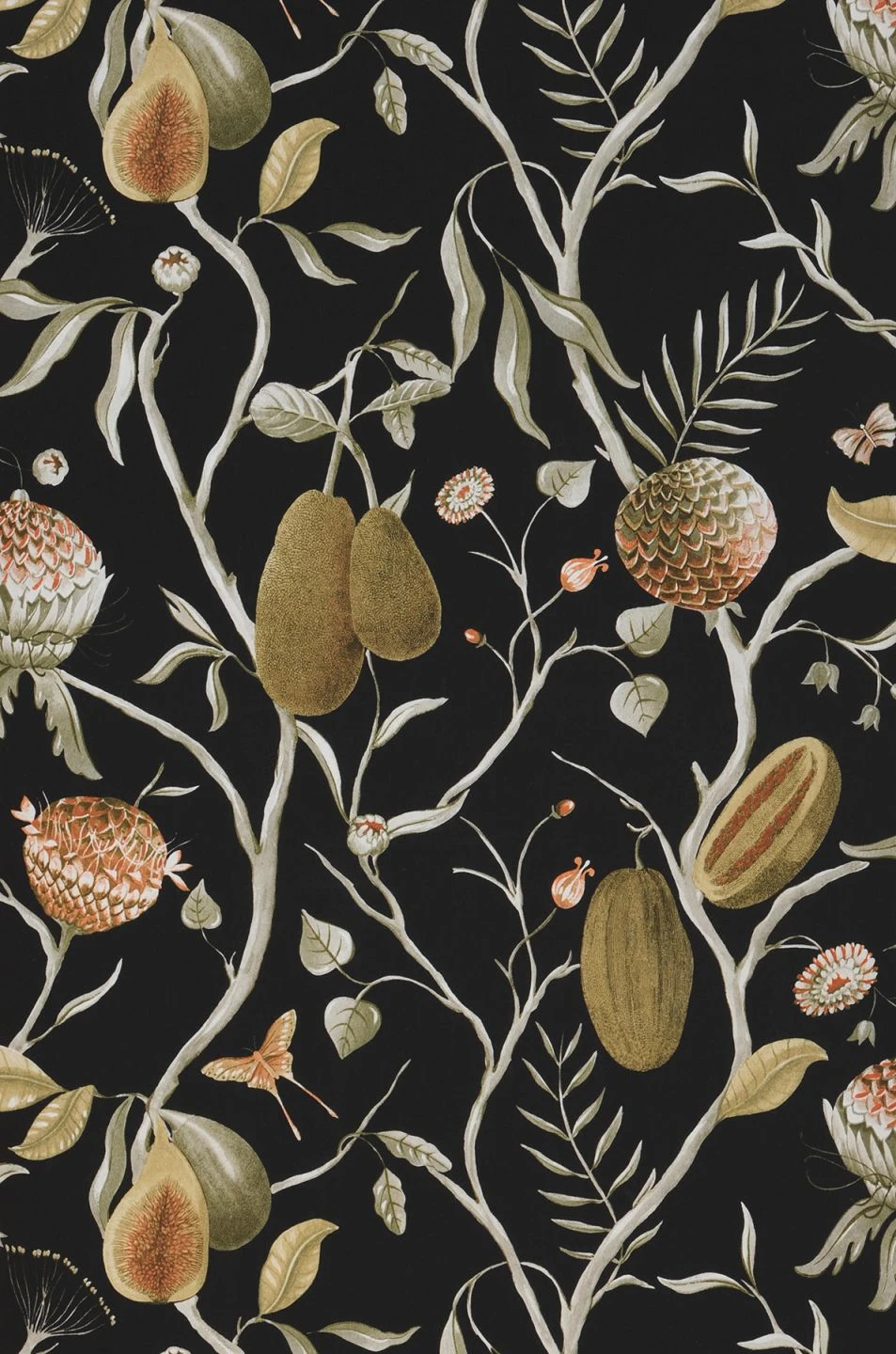 Auf schlichtem schwarzem Untergrund winden sich rankende Zweige umeinander. Blüten, verschiedenste Früchte und Schmetterlinge symbolisieren Fruchtbarkeit und das pralle Leben des Spätsommers. Die vorherrschenden hellen Farbtöne – Elfenbein, Hellgrau, Olivgrün, Rotorange und Weiß – sind ästhetisch aufeinander abgestimmt und heben sich vom dunklen Hintergrund ab, ohne zu grell zu wirken.