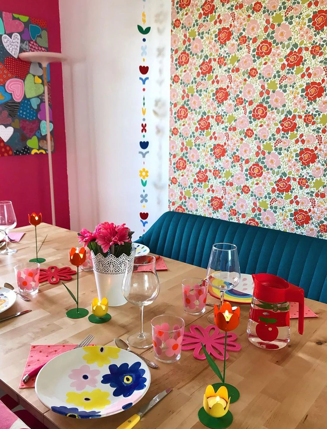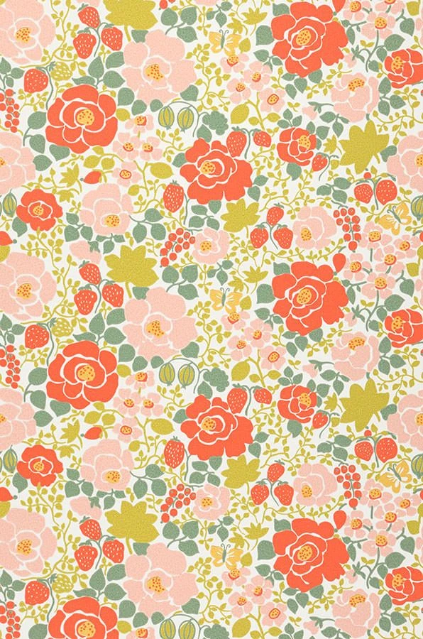 Die Farbenpracht des Sommers ist im Leimdruckverfahren auf dieser Tapete voller Leuchtkraft festgehalten. Das kräftige Rotorange der Rosen, Erdbeeren und Johannisbeeren, Blumen in hellem Rosa, Schmetterlinge mit gelben Flügeln, dazwischen Stachelbeeren und Blätter in Gelbgrün und Dunkelgrün ergeben einen Farb- und Formenmix voller Lebensfreude. Auf dem weißen Untergrund entfalten die Farben Strahlkraft und Fröhlichkeit.